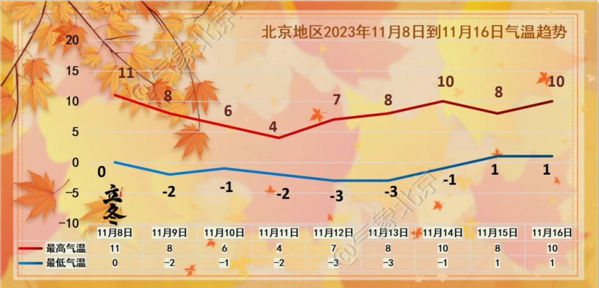 8日(周三、立冬节气)白天:多云间晴;北转南风2、3级;平原地区最高气温11℃,山区最高气温8~11℃;最小相对湿度30%。