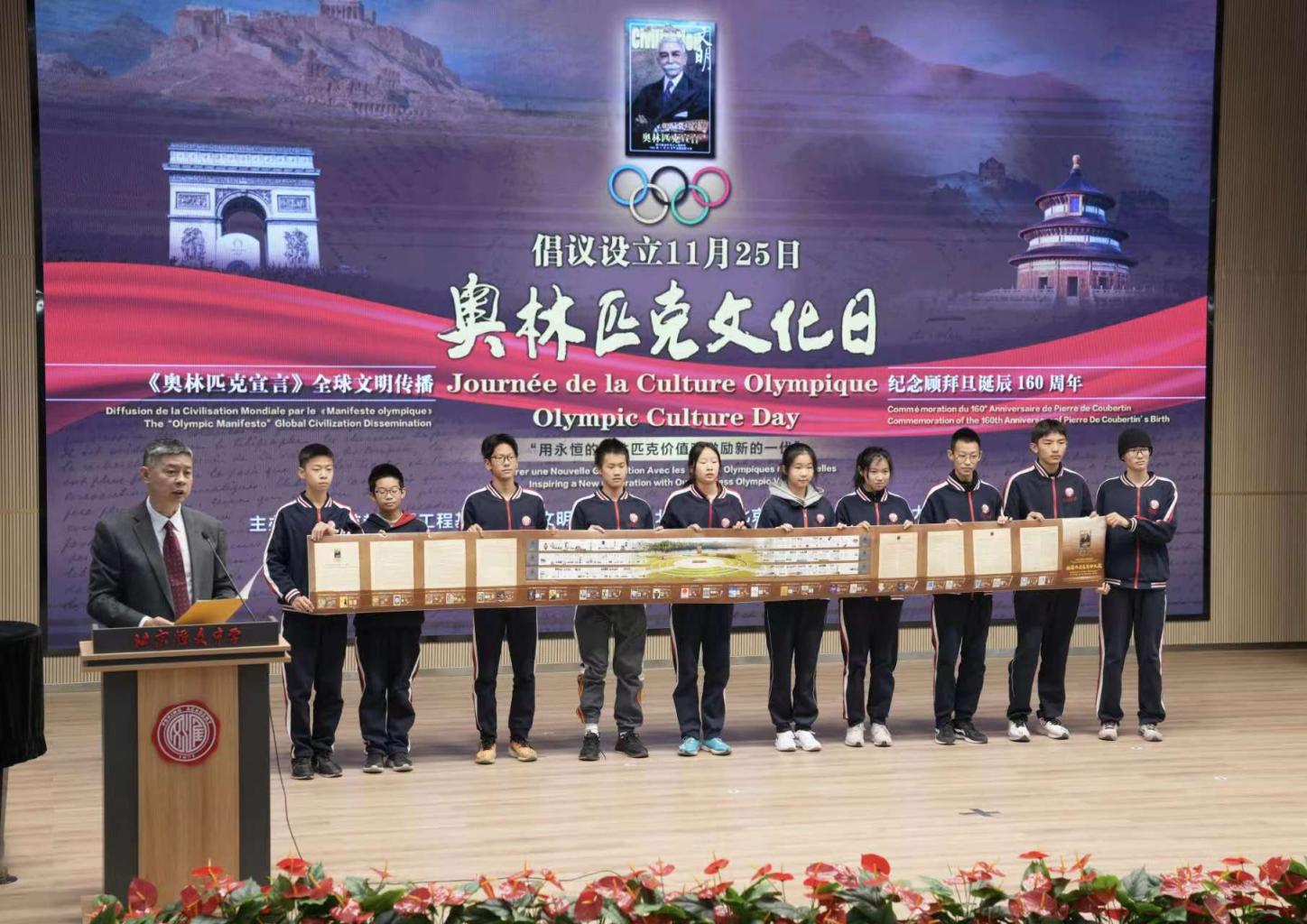 11月25日,纪念顾拜旦诞辰160周年暨倡议设立“奥林匹克文化日”活动,在北京汇文中学举行,这里是“中国奥运第一人”刘长春备战训练场所在地。在操场上,“跑向法国巴黎:向奥林匹克致敬”汇文校园迷你接力跑率先进行。在报告厅内,来自15个国家的留学生代表和来自北京大学、北京体育大学、北京语言大学、中央美术学院、北京汇文中学以及十余所小学的师生代表,以分组接力诵读《奥林匹克宣言》(节选)和《体育颂》的方式向奥林匹克精神致敬,体操奥运会冠军刘洋等运动员代表也加入其中。在这个特殊的日子里,中国北京携手法国巴黎、希腊雅典及其他举办过奥运会的国家与城市,以《奥林匹克宣言》传播和“《奥林匹克宣言》——美丽的奥林匹克文化长卷”传递为纽带,向国际奥林匹克大家庭所有成员发出倡议:将每年11月25日设立为“奥林匹克文化日”。《文明》杂志社社长娄晓琪现场宣读了倡议书。