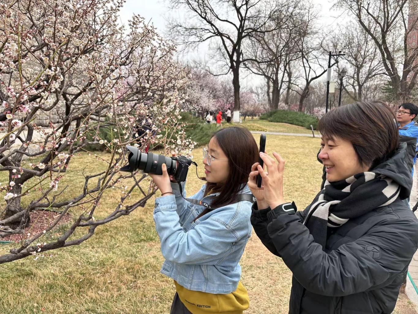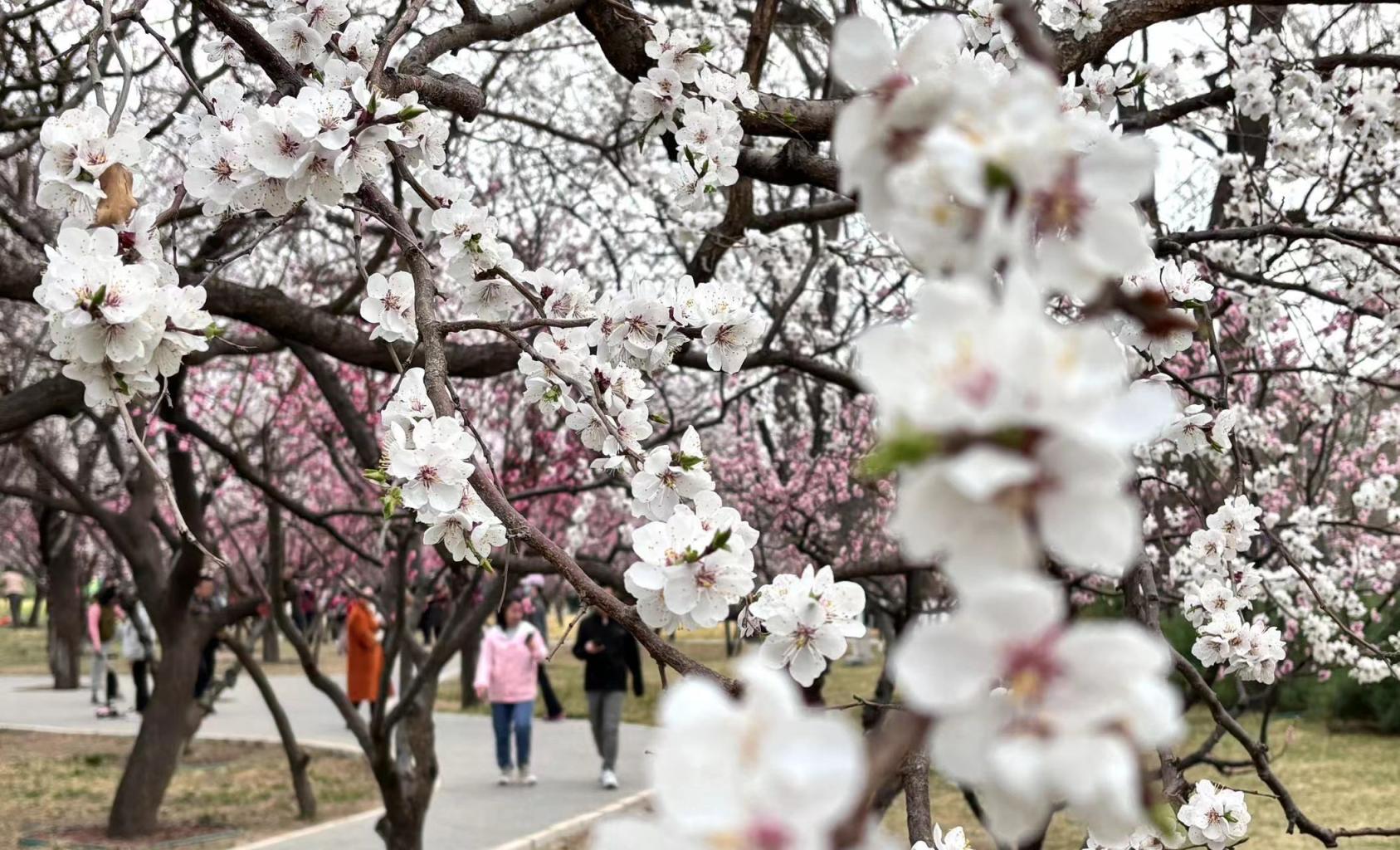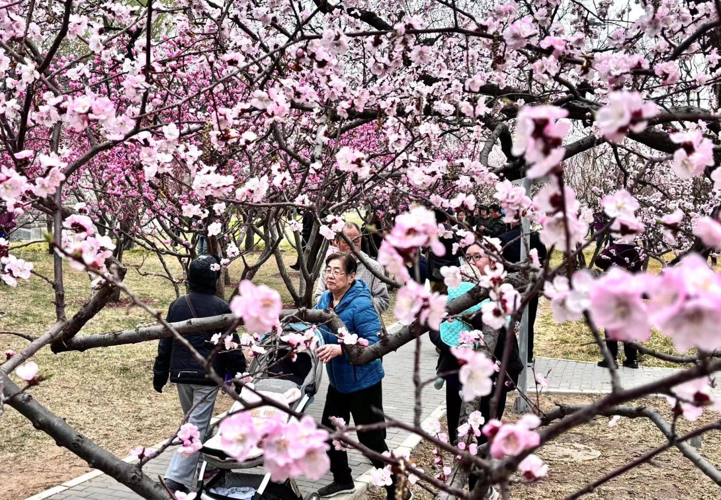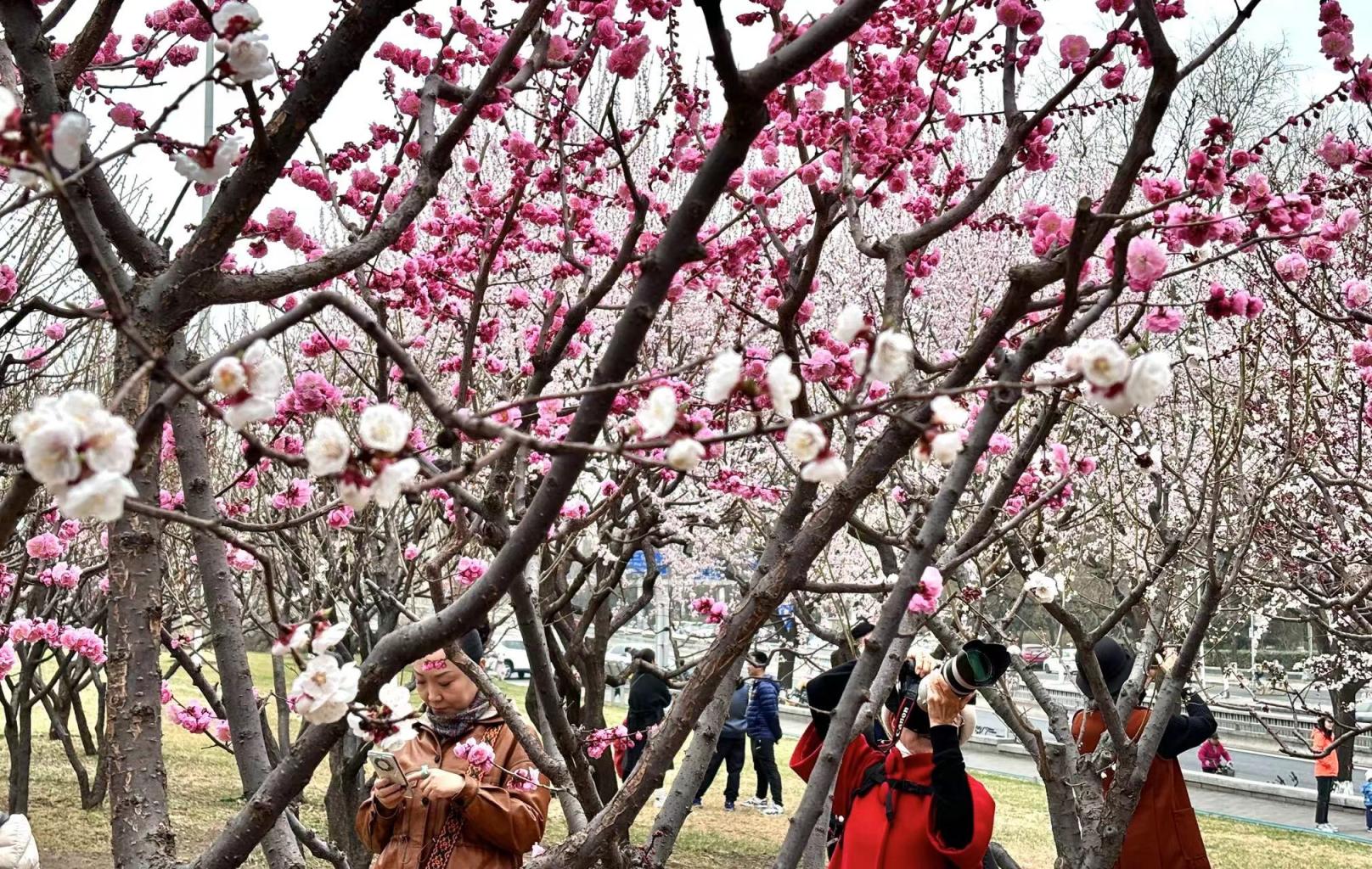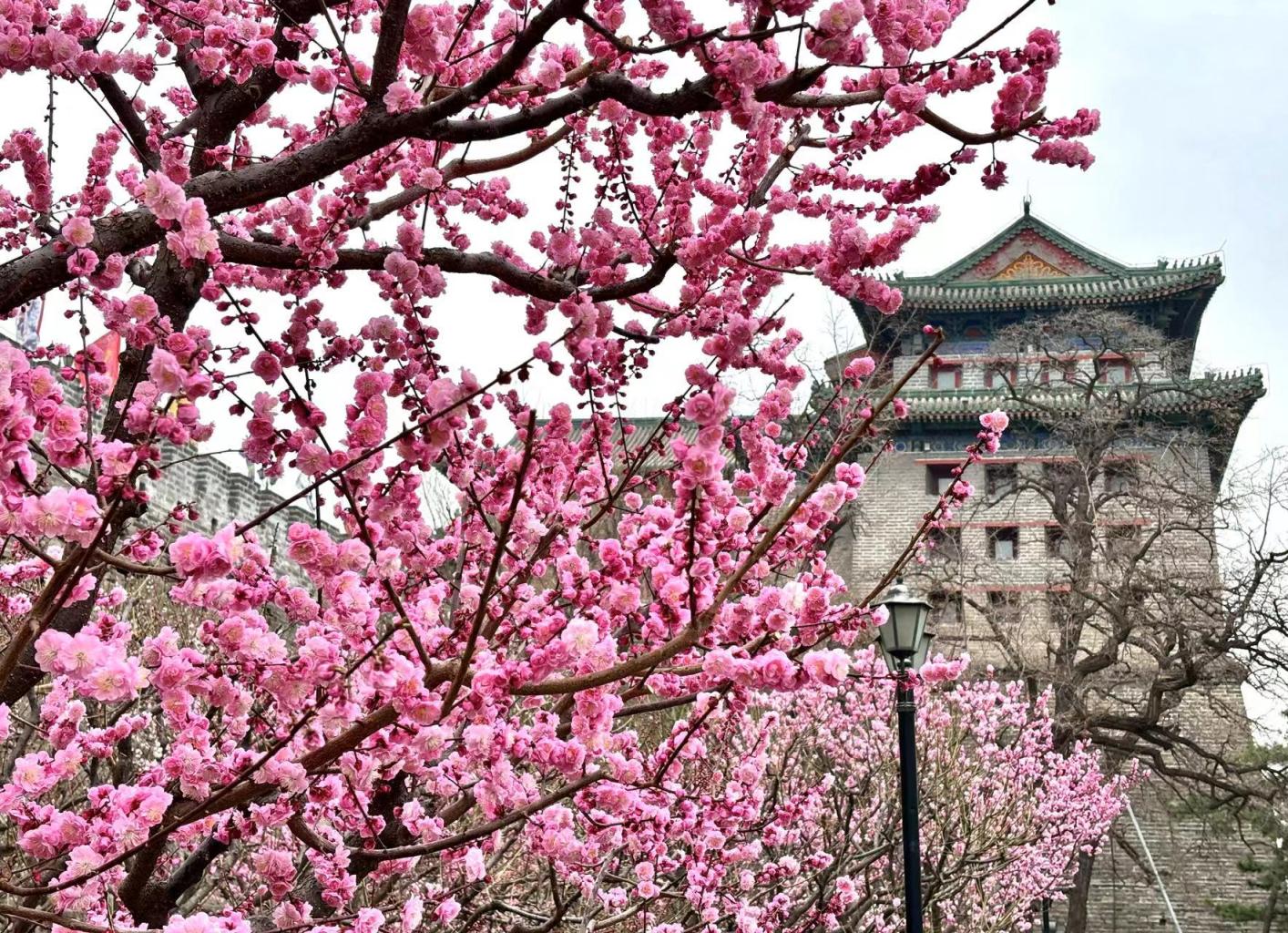3月24日,北京的明城墙遗址公园内梅花已大规模盛放,已进入赏梅的最佳观赏期,城墙春景吸引大批市民游客前来赏花拍照,感受春天的气息。