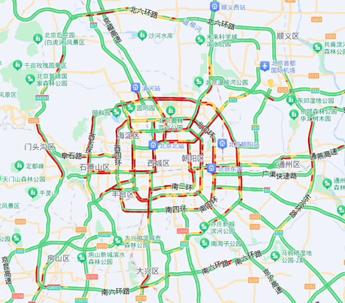 下午至晚间,城区东部、北部、西部环路部分路段,万泉河路、学院路、通惠河北路、莲石东路等主要联络线出城方向局部路段交通压力集中。京藏、京承、京港澳、京开、首都机场高速、京通快速等主要高速出京方向以及六环路部分路段车流量较平日增加,部分常态拥堵路段及互通匝道将出现车行缓慢的情况。