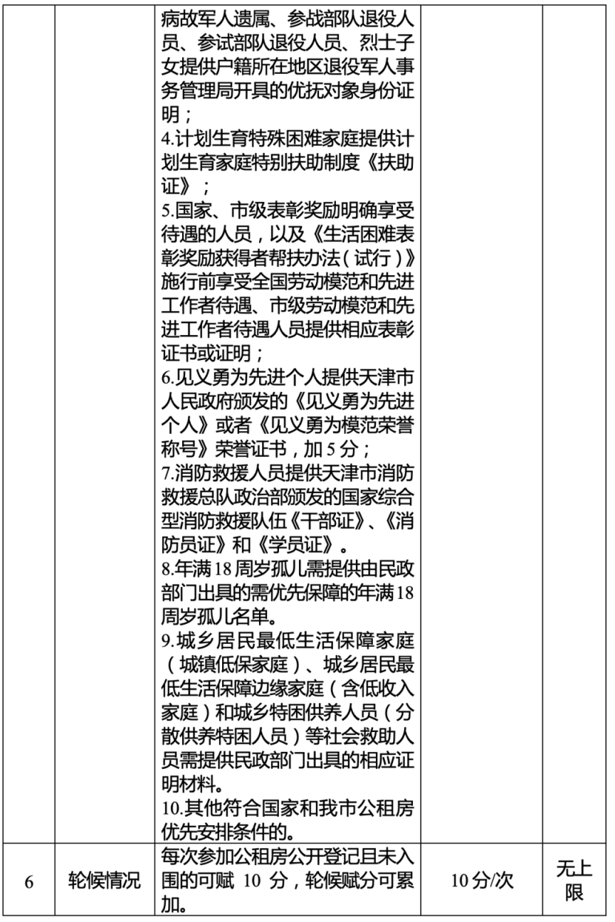 按照申请家庭总年龄、成员人数、未成年子女数、享受租房补贴情况、优先保障情况以及登记轮候情况为申请家庭赋分,以资格审核时各项赋分之和确定综合评分。根据国家和我市有关保障对象优先安排的规定,确定优先保障情况分值为50分,其他情况分值为10分至15分。赋分项目和具体分值详见下图明细表↓