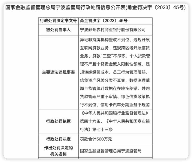 4月15日,金融监管总局昌吉监管分局公布对上海浦东发展银行昌吉支行的罚单,因互联网贷款贷后管理不到位等违法违规行为,该行被罚款60万元。而在1月,宁波鄞州农村商业银行和东营银行也分别被罚560万元和40万元,其中违法违规行为涉及违规开展互联网贷款业务、互联网贷款管理不审慎等。