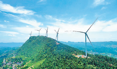 贵州省铜仁市依托区位优势,大力发展新能源产业,目前清洁能源电力装机占比超八成。南方电网贵州铜仁供电局全力做好清洁能源并网和消纳工作,为当地经济社会发展提供了源源不断的绿色动能。图为铜仁市印江土家族苗族自治县白京岩风电场。向世杰摄(人民视觉)