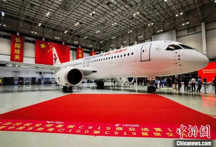 5月27日,国产大飞机商运一周年之际,中国东方航空在上海接收增订100架C919的首架机。(中国东方航空供图)