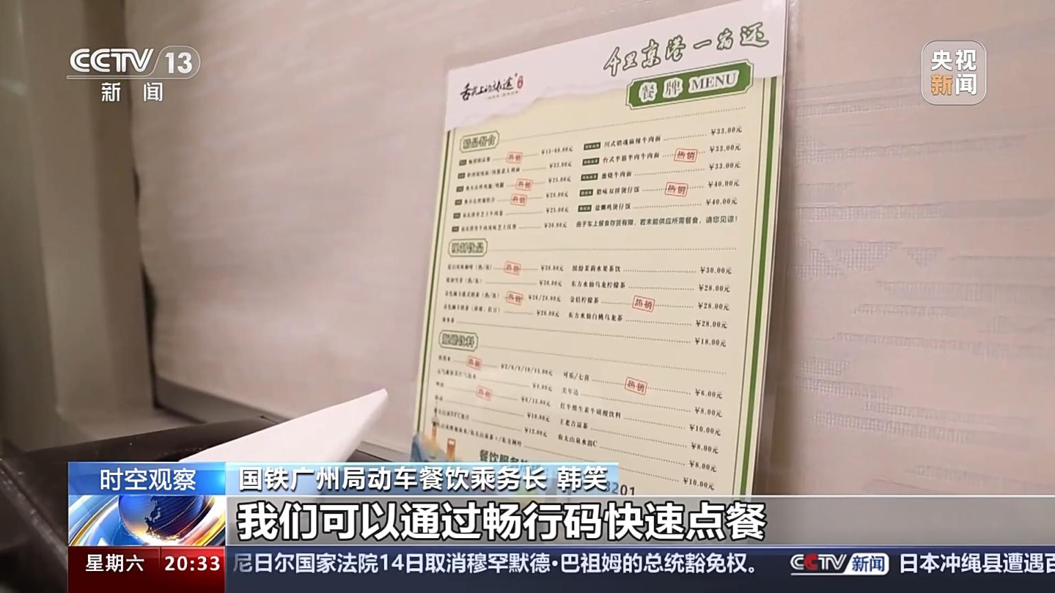 国铁广州局动车餐饮乘务长 韩笑:为满足不同旅客晚餐和早餐的用餐需求,我们是24小时营业的。每个动卧车厢都设置了一个独立的餐牌,方便旅客了解和选择餐食品种,我们可以通过畅行码快速点餐。