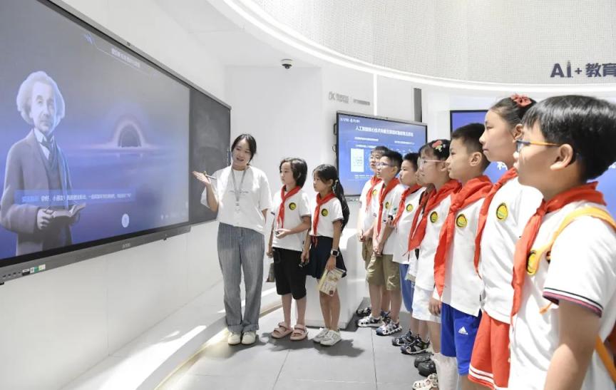 小朋友走进科大讯飞人工智能体验馆,了解人工智能在教育方面的应用。