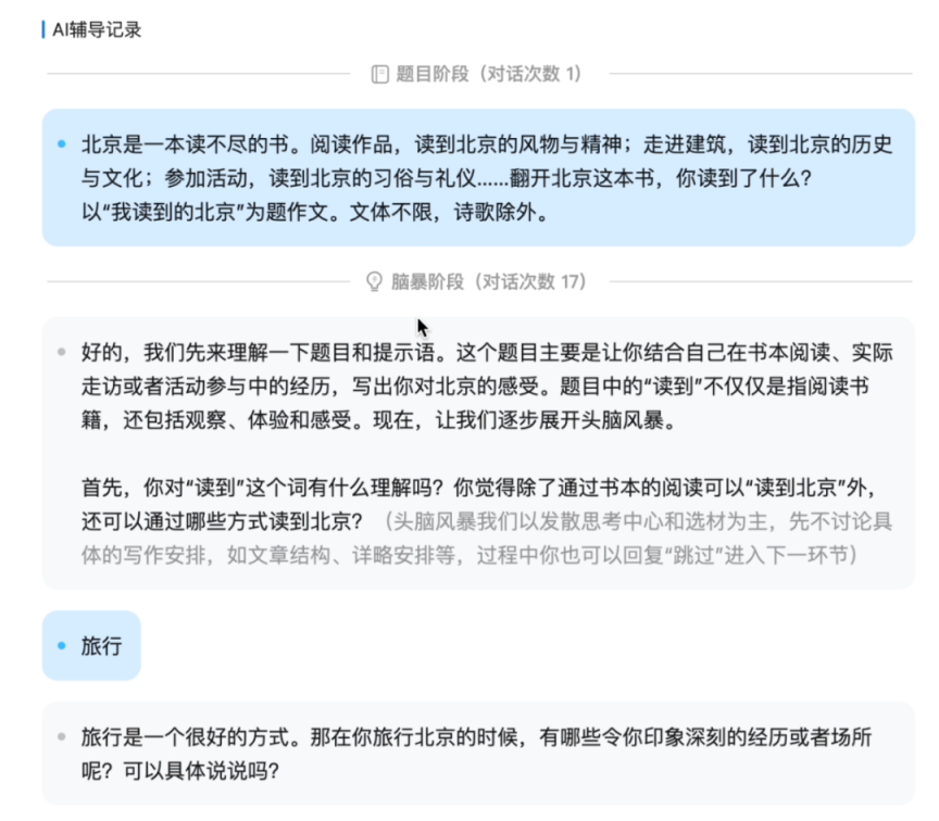 半月谈记者现场体验了和AI对话,事实上AI助手的提问都是偏向引导类的问题,比如“这让你回忆起什么样的体验?”“当时你是什么感受?”“在你阅读过的书中有什么与之相关的内容?”这类发散式的提问,能够调动起每位学生的“独家记忆”。根据学生的回答,AI助手会总结出作文的角度供学生参考。