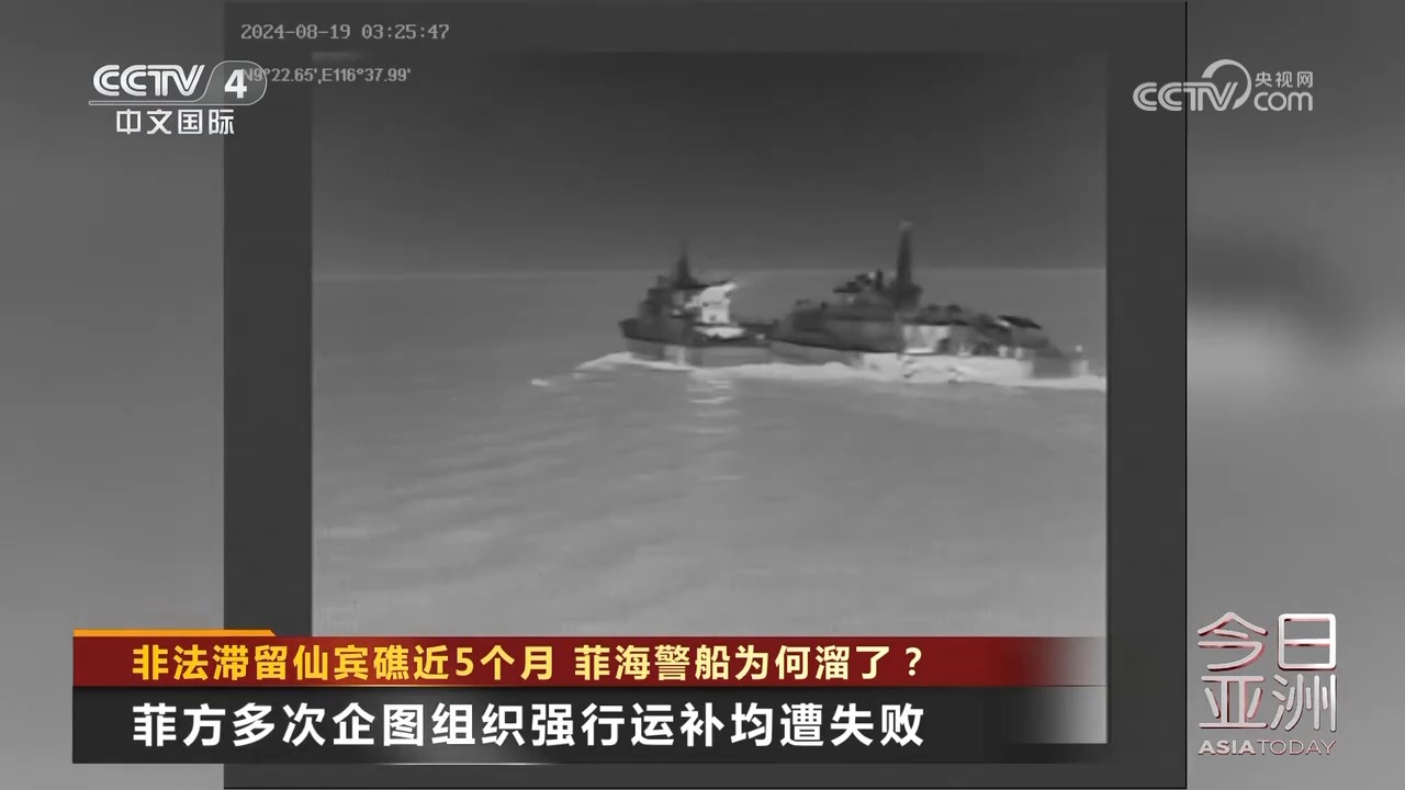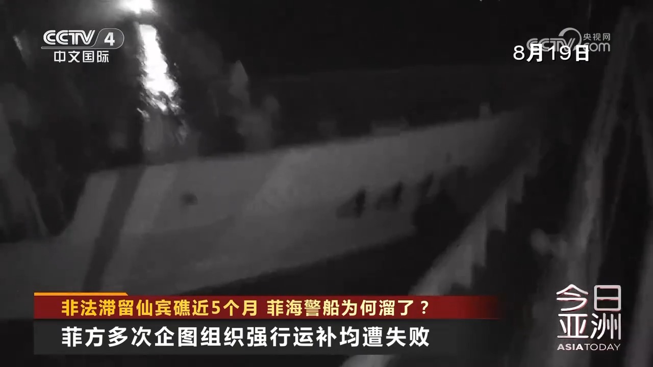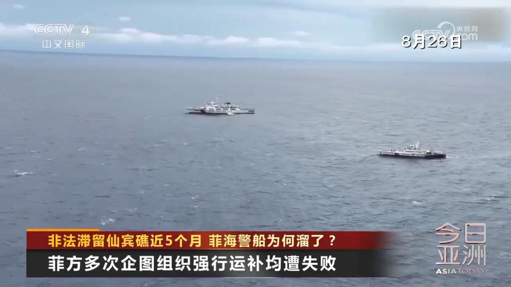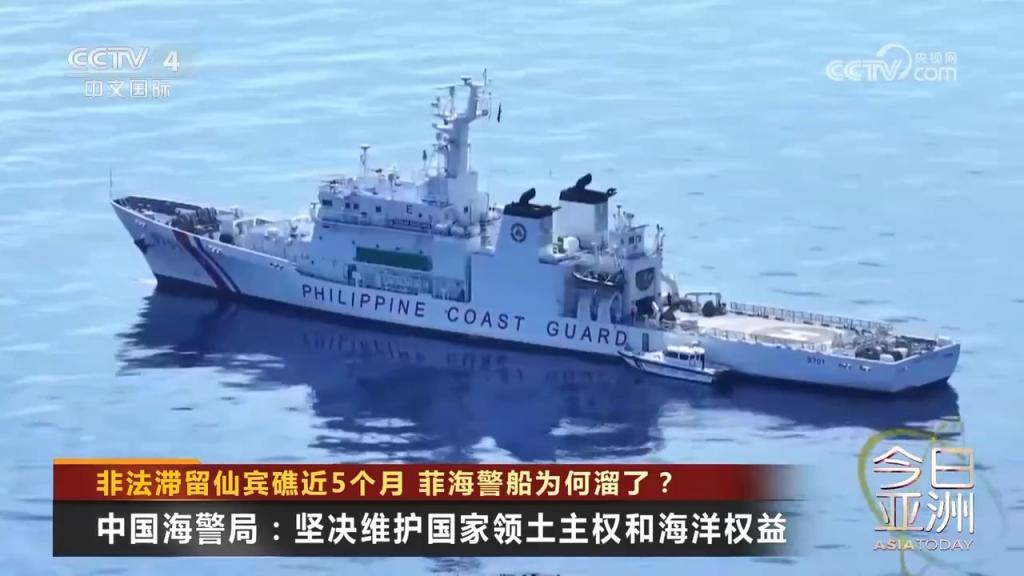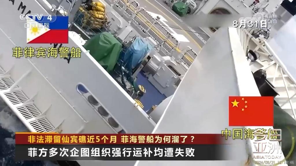 8月31日,菲律宾非法滞留中国仙宾礁的海警9701号船起锚,位仙宾礁潟湖内持续机动、寻衅肇事,并以不专业、危险方式故意冲撞中方正常维权执法的5205舰左舷,导致发生擦碰。