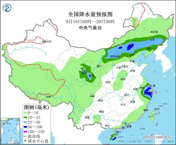 9月19日08时至20日08时,内蒙古中部、吉林中南部、辽宁中北部、河北北部、北京、青海东部、甘肃河西、江苏东南部、浙江北部、上海、安徽东南部、海南岛等地部分地区有中到大雨,其中,内蒙古中部、河北北部、上海大部、浙江北部、海南岛东部等地部分地区有暴雨或大暴雨(100~130毫米)。黑龙江东北部、江苏南部等地部分地区有4~6级风。