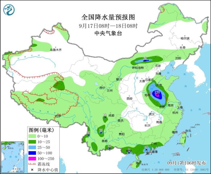 全国降水量预报图(9月17日08时-18日08时)。图片来源:中央气象台网站
