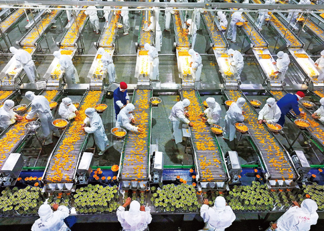 图为2023年11月4日,工人在湖北省秭归县屈姑国际农业集团柑橘加工车间生产线上忙碌。 新华社发 王辉富/摄