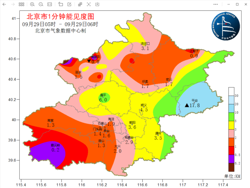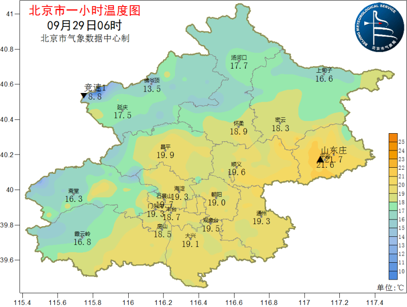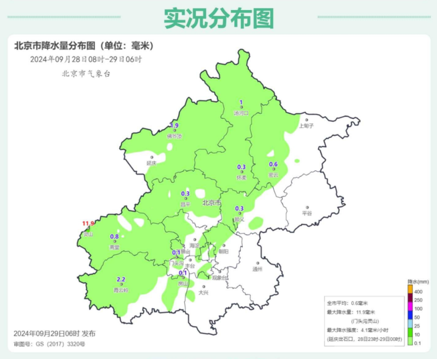 09月28日08时至29日06时全市平均降水量0.6毫米,城区平均0.2毫米。最大降水量出现在门头沟灵山11.9毫米;最大降水强度出现在延庆岔石口,28日23时-29日00时降水4.1毫米。最近一小时最大降水量为延庆小海陀0.2毫米。