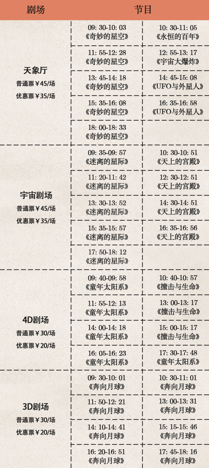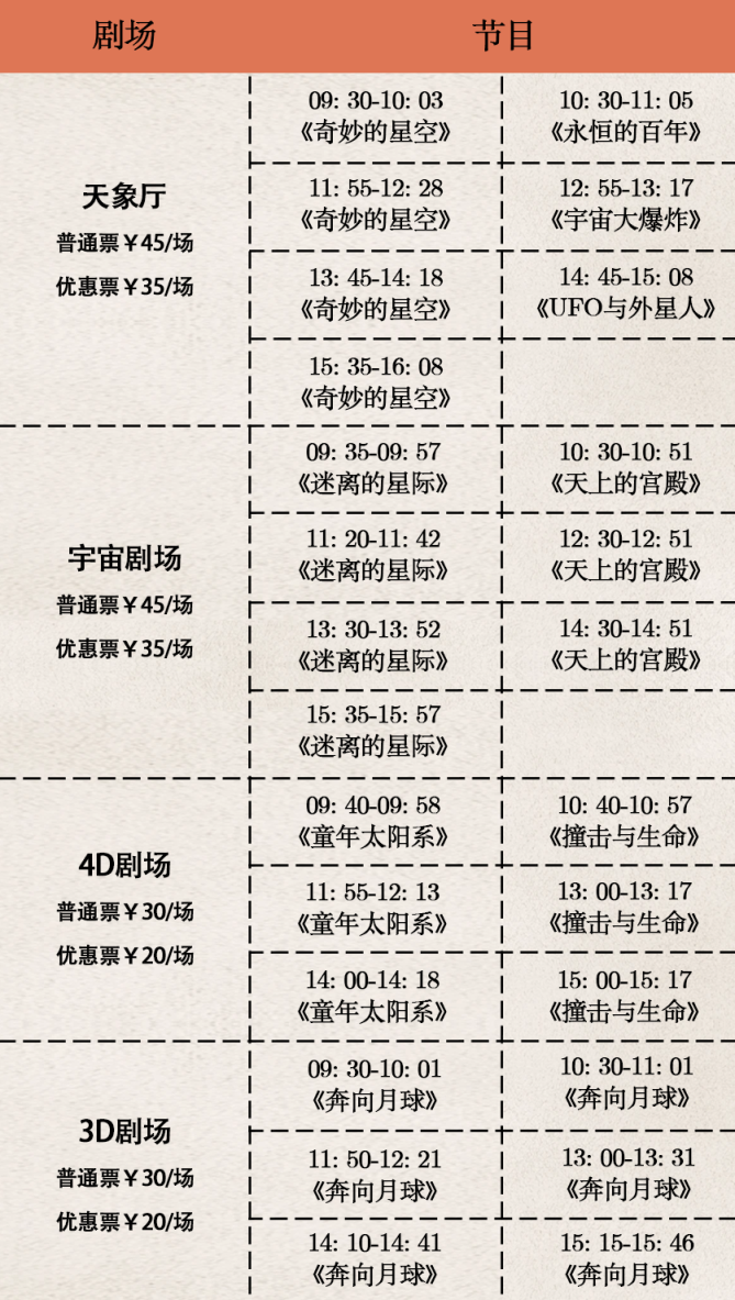 1.观看科普影片所有人均须购票,无免费人群。特殊人群可享受优惠票价,详见购票界面的优惠政策;2.因科普活动需使用剧场场地,部分影片播放时间略有调整,具体安排以购票界面时间为准;3.临时调整,以售票处通告为准。