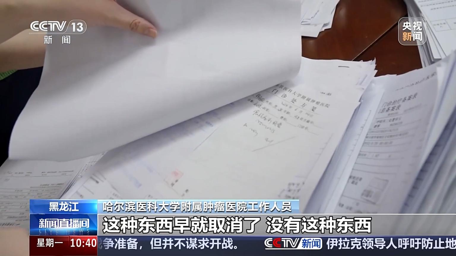 这些手写处方,开具的药品数额单张少则近千元,多则一两万元,这种大额的特殊药品处方,本应管理更加严格,怎么会是手写的呢?检查组注意到,这些手写处方很多标注来自哈尔滨医科大学附属肿瘤医院等医疗机构。那么这些处方是不是从这些医院开具的呢?