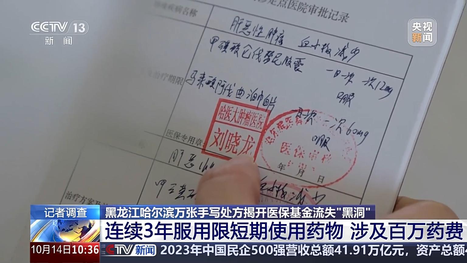 国家医保局专项飞检调查人员 刘晶华:这两本就是比较整整齐齐,整本就没有撕开,内容是不同的药品,医生也是不同的医生。已经加盖好了医生印章,这个应该是预设好的,因为这个医生是不同的科,对应的是不同的靶向药。