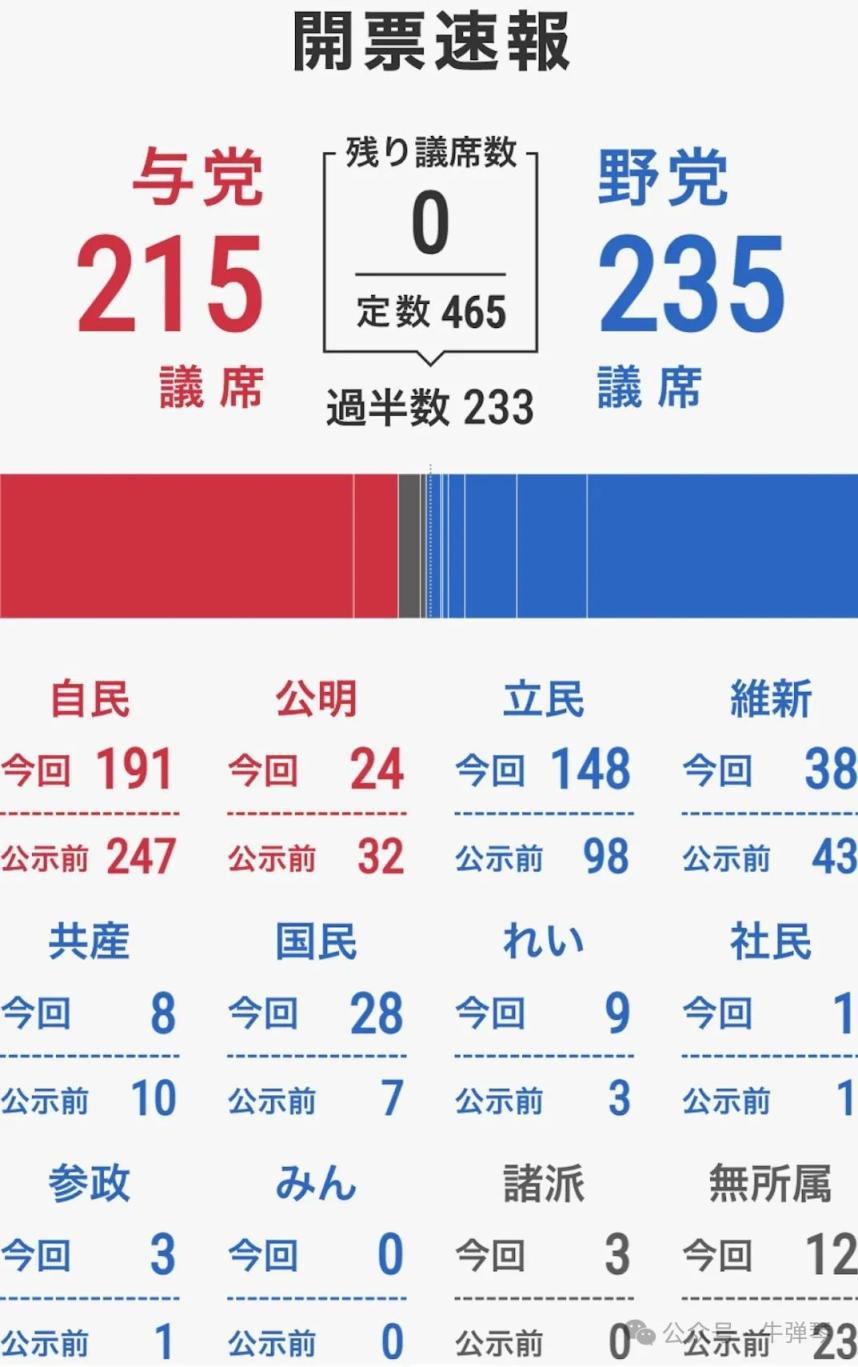 当然,也不出意料,日本自民党惨败,失去了执政多数席位。毫无疑问,这对刚上台没几天的日本新首相石破茂来说,是一个沉重的打击。