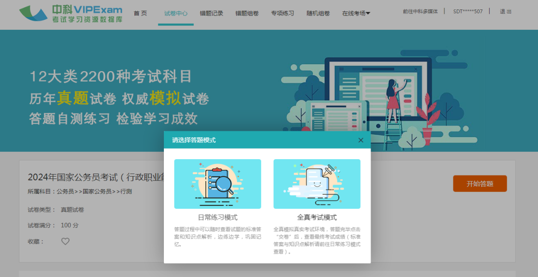 中科多媒体教育资源数据库里“试卷中心”-“公务员/国家公务员”-“真题试卷”下的所有套卷,均有“日常练习模式”和“全真考试模式”两种模式可选,考生可根据自己复习的实际情况进行选择,有针对性地训练~
