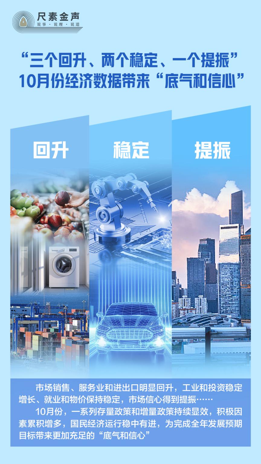 10月份,一系列存量政策和增量政策协同发力、持续显效,高质量发展扎实推进,积极因素累积增多,国民经济运行稳中有进、稳中有升,为我们完成全年发展预期目标带来更加充足的“底气和信心”。