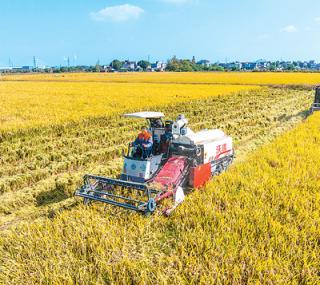 安徽省芜湖市繁昌区新东村,农民驾驶农机在高标准农田里收割杂交水稻。肖本祥摄(人民视觉)