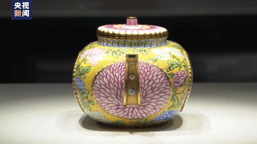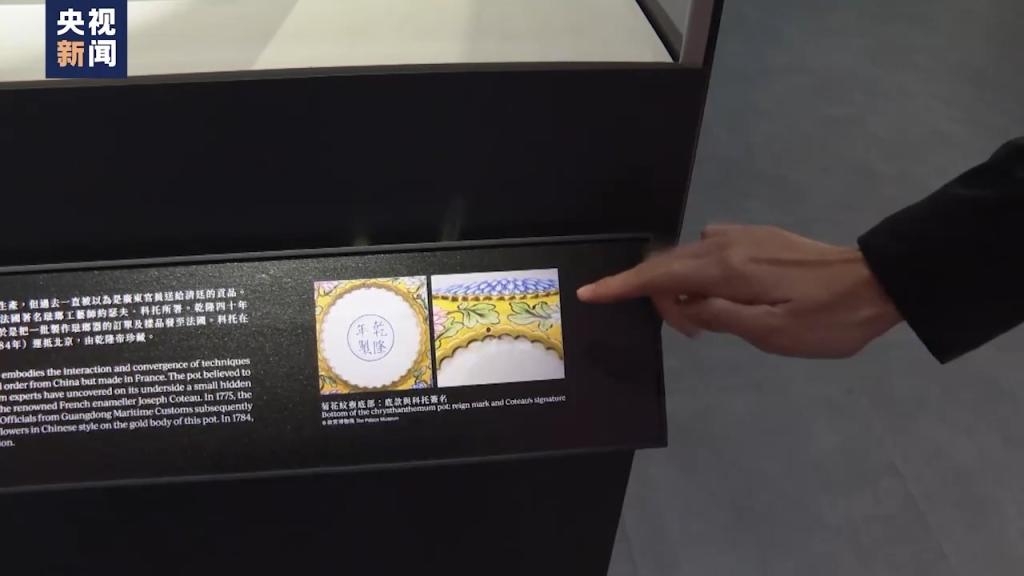 总台记者 马媛:在本次特展上,我们发现了一件非常特别的重量级作品,就是这个菊花纹壶。这件作品一直收藏于故宫博物院,直到近年专家才发现,它其实是一件“中国订制,法国制造”的作品。我们来看,这个底款印有“乾隆年制”,但边缘一个不起眼的位置却印有一个名字,这是法国珐琅工艺师的名字。乾隆四十年下令,打造新品且要用“珐琅工艺”。因此,这件壶是在法国制作完成后,运到北京,由乾隆帝收藏,可以说它见证中法文化交流的历史。