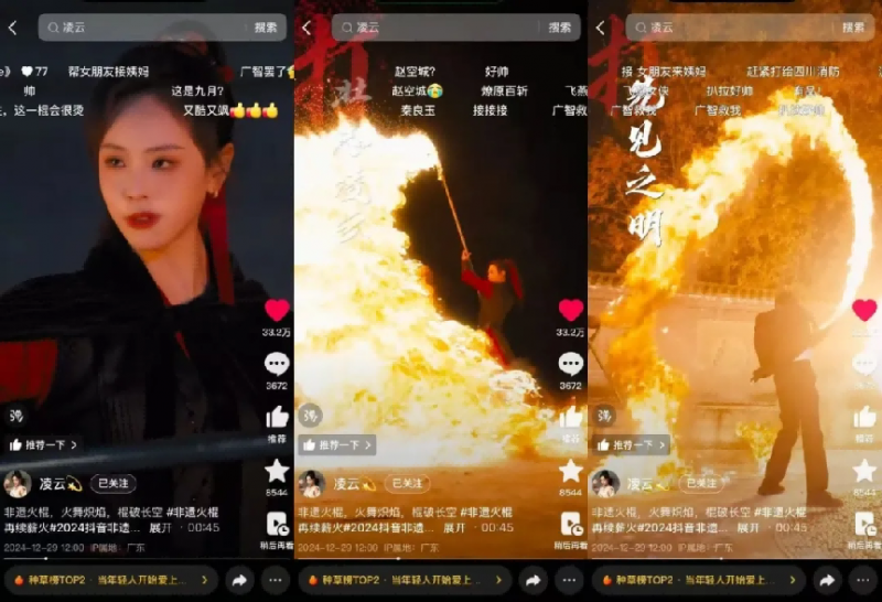 26岁的峨眉武术非遗传承人@凌云 ,多年来致力于通过短视频平台弘扬峨眉武术、中国武术。近期,与其他非遗传承人共同呈现一场非遗火棍功夫。视频中,一位位非遗传承人的火棍表演中,穿插着创作者对于壮志凌云、临危不惧等美好品质的赞扬,也让观众在炽热的火焰中,感受到非遗技艺的力量,体味对2025年的美好祝愿。