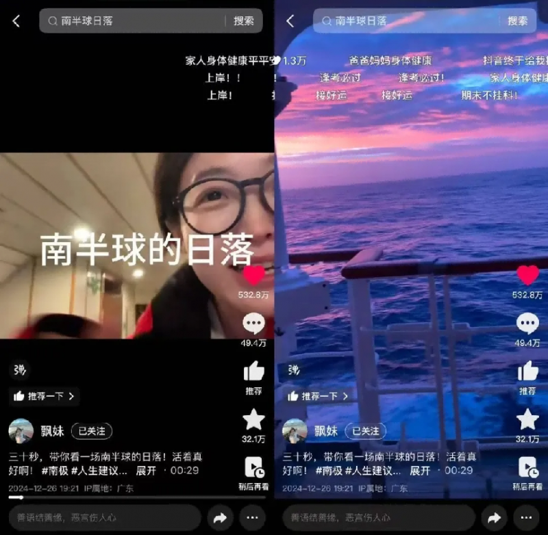 无独有偶,旅行区创作者@飘妹 在年底通过一则南极视频,带领大家在家中看了一场南半球的日落。@幻想家姜时一 则通过纪录旅途中的摄影过程,收获了许多喜爱,网友们将她称为自己的“互联网脚替”。在前几日的抖音精选开放麦中,她说:“幻想家不会只是幻想家,梦想,也一定不会辜负你。”
