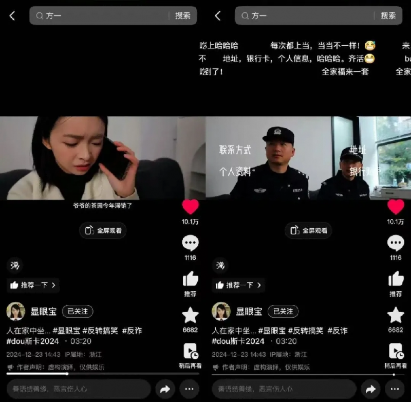 12月,一则《人在家中坐……》的视频走红,搞笑创作者@显眼包 利用剧情反诈骗,与@丽水公安 合作,完成了一场防诈骗科普。