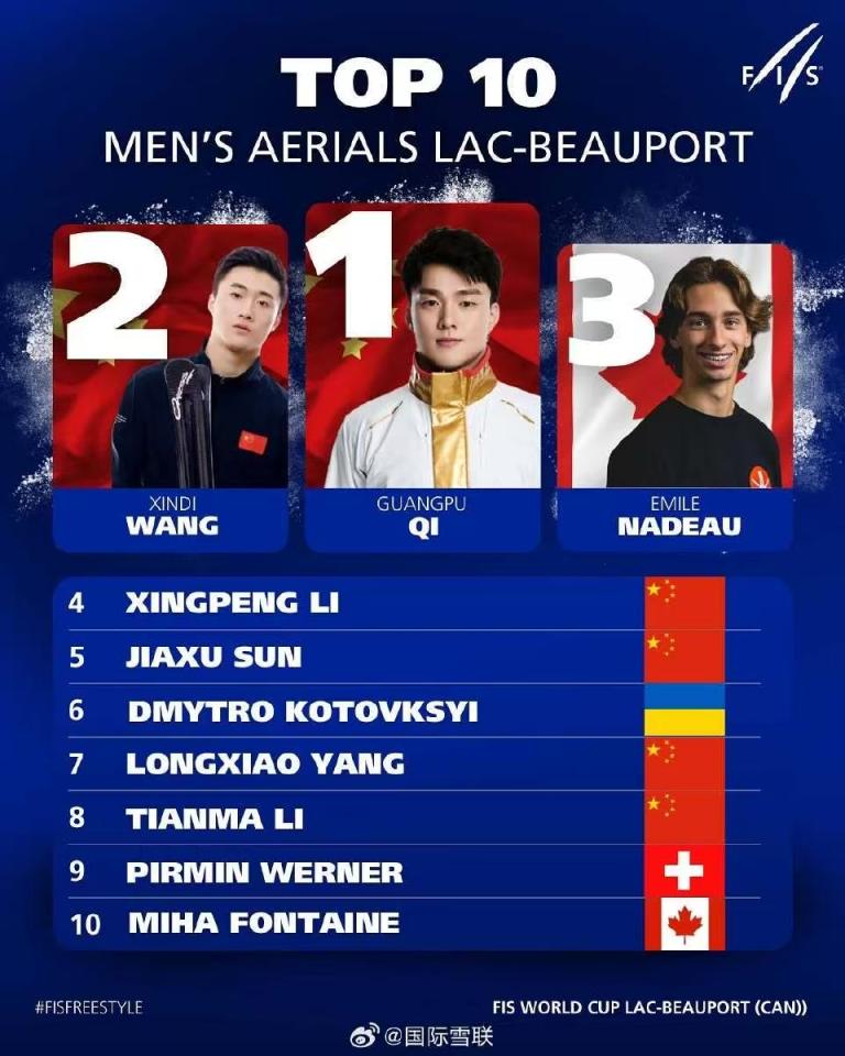 北京时间1月27日凌晨,自由式滑雪空中技巧世界杯玻波湖站结束了第二次比赛。中国选手齐广璞和王心迪包揽男子组冠亚军。