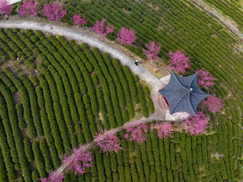 2月16日,游客在湖北省宜昌市秭归县茅坪镇建东村的一处高山茶园赏花游玩。新华社发(雷勇摄)