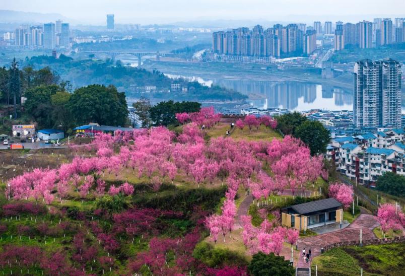 2月13日,在重庆市永川区大安街道德胜桥村,一列高铁列车驶过一片梅花花海。新华社发(陈仕川摄)