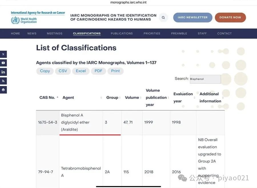 国际癌症研究机构(IARC)将双酚A归为3类,即“未充分证明致癌性”。