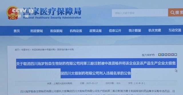 公告显示,药监部门2025年3月3日—3月7日的检查结果显示,持有人未能对受托生产企业生产过程进行有效监控,受托生产企业部分批次产品关键生产过程出现偏差,未按规范要求开展偏差处理。综合评定结论为不符合药品生产质量管理规范(GMP)要求。已暂停太极集团四川太极制药有限公司间苯三酚注射液生产,暂停四川海梦智森生物制药有限公司间苯三酚注射液上市销售。