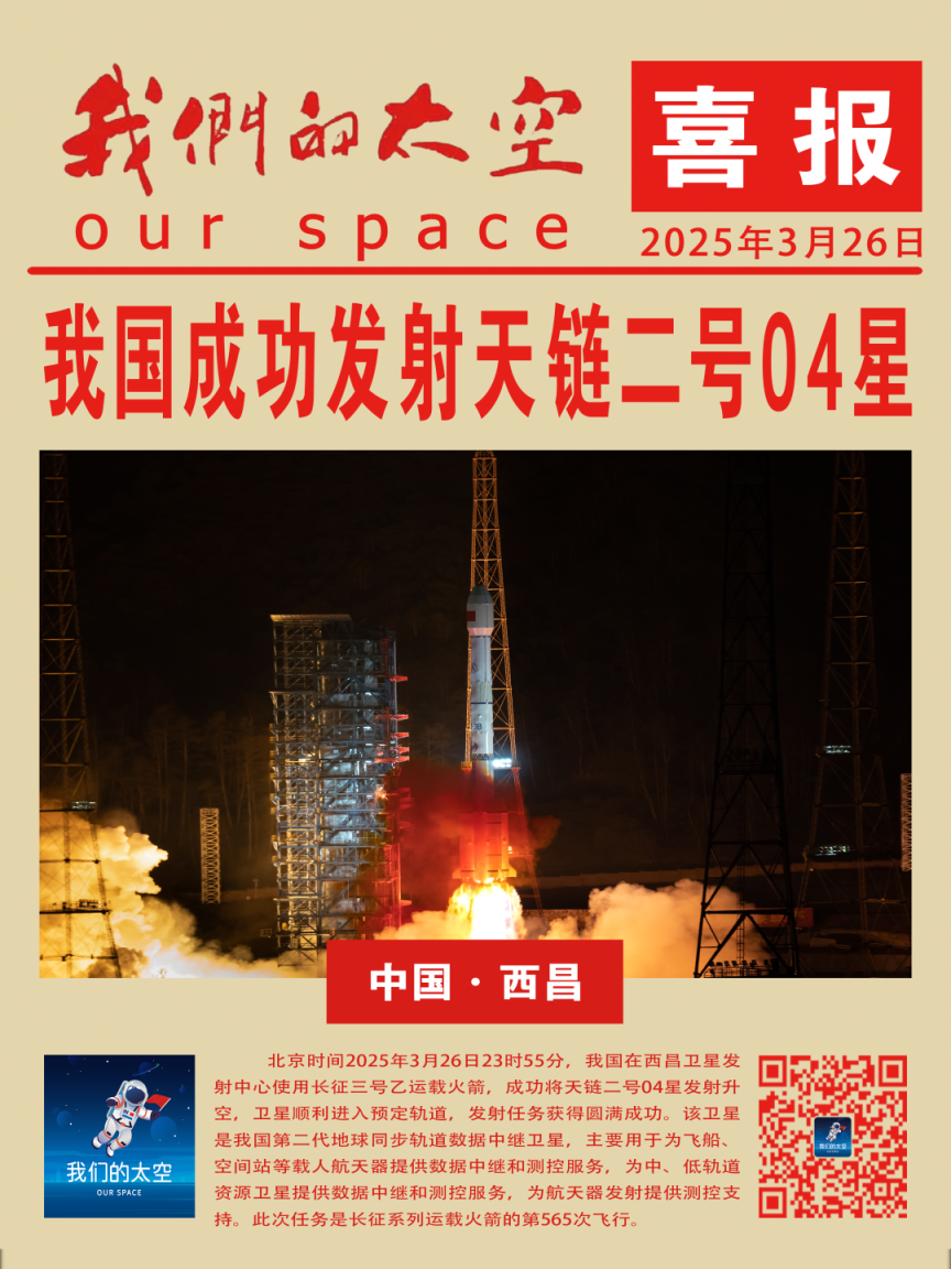 北京时间2025年3月26日23时55分,我国在西昌卫星发射中心使用长征三号乙运载火箭,成功将天链二号04星发射升空,卫星顺利进入预定轨道,发射任务获得圆满成功。该卫星是我国第二代地球同步轨道数据中继卫星,主要用于为飞船、空间站等载人航天器提供数据中继和测控服务,为中、低轨道资源卫星提供数据中继和测控服务,为航天器发射提供测控支持。
