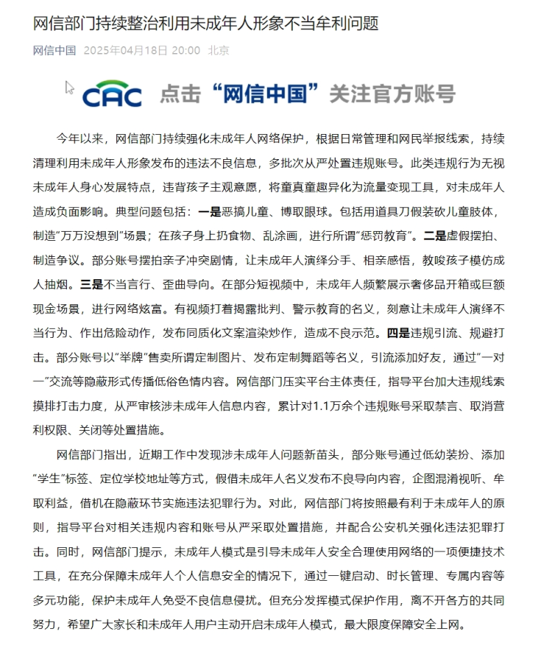 今年以来,网信部门持续强化未成年人网络保护,根据日常管理和网民举报线索,持续清理利用未成年人形象发布的违法不良信息,多批次从严处置违规账号。此类违规行为无视未成年人身心发展特点,违背孩子主观意愿,将童真童趣异化为流量变现工具,对未成年人造成负面影响。典型问题包括:一是恶搞儿童、博取眼球。包括用道具刀假装砍儿童肢体,制造“万万没想到”场景;在孩子身上扔食物、乱涂画,进行所谓“惩罚教育”。二是虚假摆拍、制造争议。部分账号摆拍亲子冲突剧情,让未成年人演绎分手、相亲感悟,教唆孩子模仿成人抽烟。三是不当言行、歪曲导向。在部分短视频中,未成年人频繁展示奢侈品开箱或巨额现金场景,进行网络炫富。有视频打着揭露批判、警示教育的名义,刻意让未成年人演绎不当行为、作出危险动作,发布同质化文案渲染炒作,造成不良示范。四是违规引流、规避打击。部分账号以“举牌”售卖所谓定制图片、发布定制舞蹈等名义,引流添加好友,通过“一对一”交流等隐蔽形式传播低俗色情内容。网信部门压实平台主体责任,指导平台加大违规线索摸排打击力度,从严审核涉未成年人信息内容,累计对1.1万余个违规账号采取禁言、取消营利权限、关闭等处置措施。