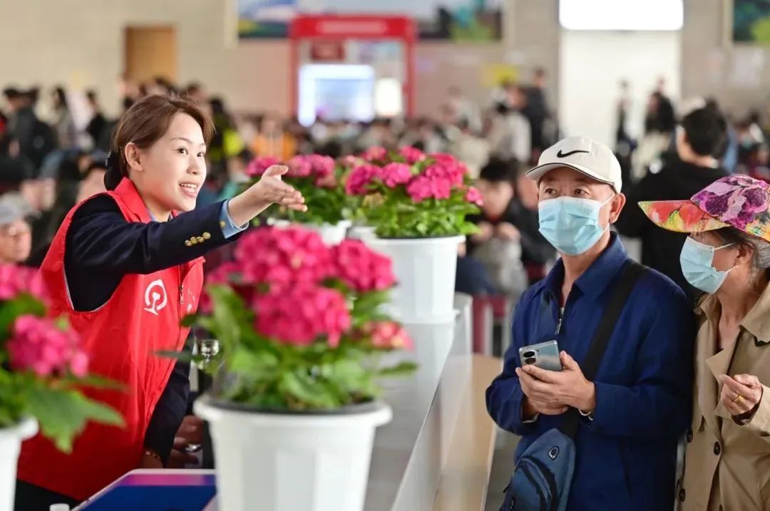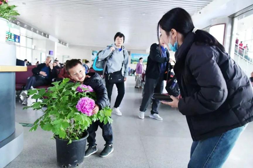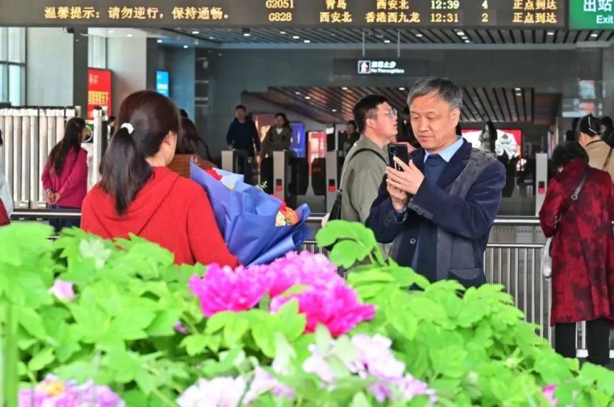 洛阳站、洛阳龙门站候车厅内,一盆盆盛开的牡丹花,吸引不少旅客拍照打卡。洛阳龙门站还在站台电子公屏,更新“国色牡丹迎君来,踏春寻梦洛阳城”的迎客标语,联合洛阳市相关部门,在出站口设置繁花打卡点。