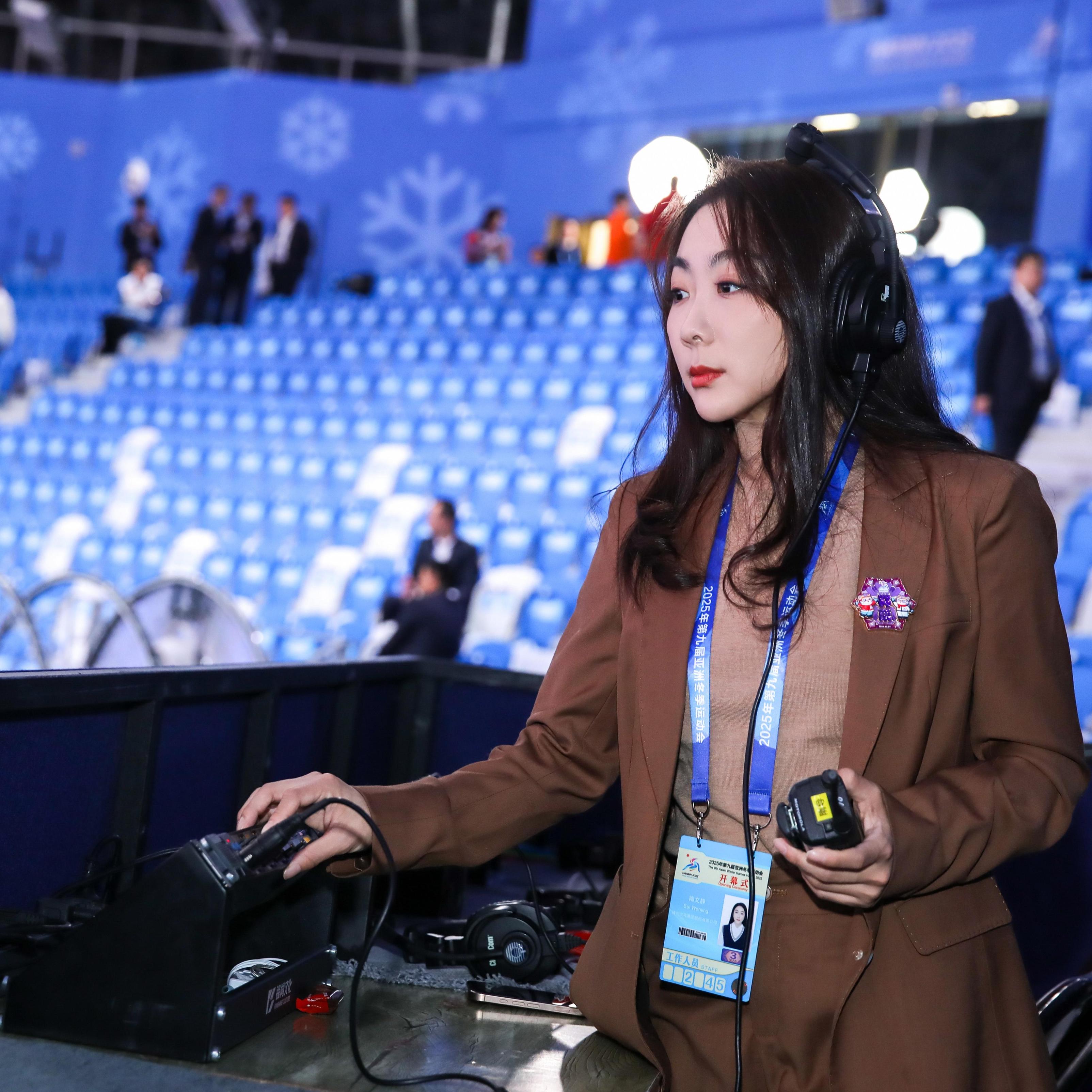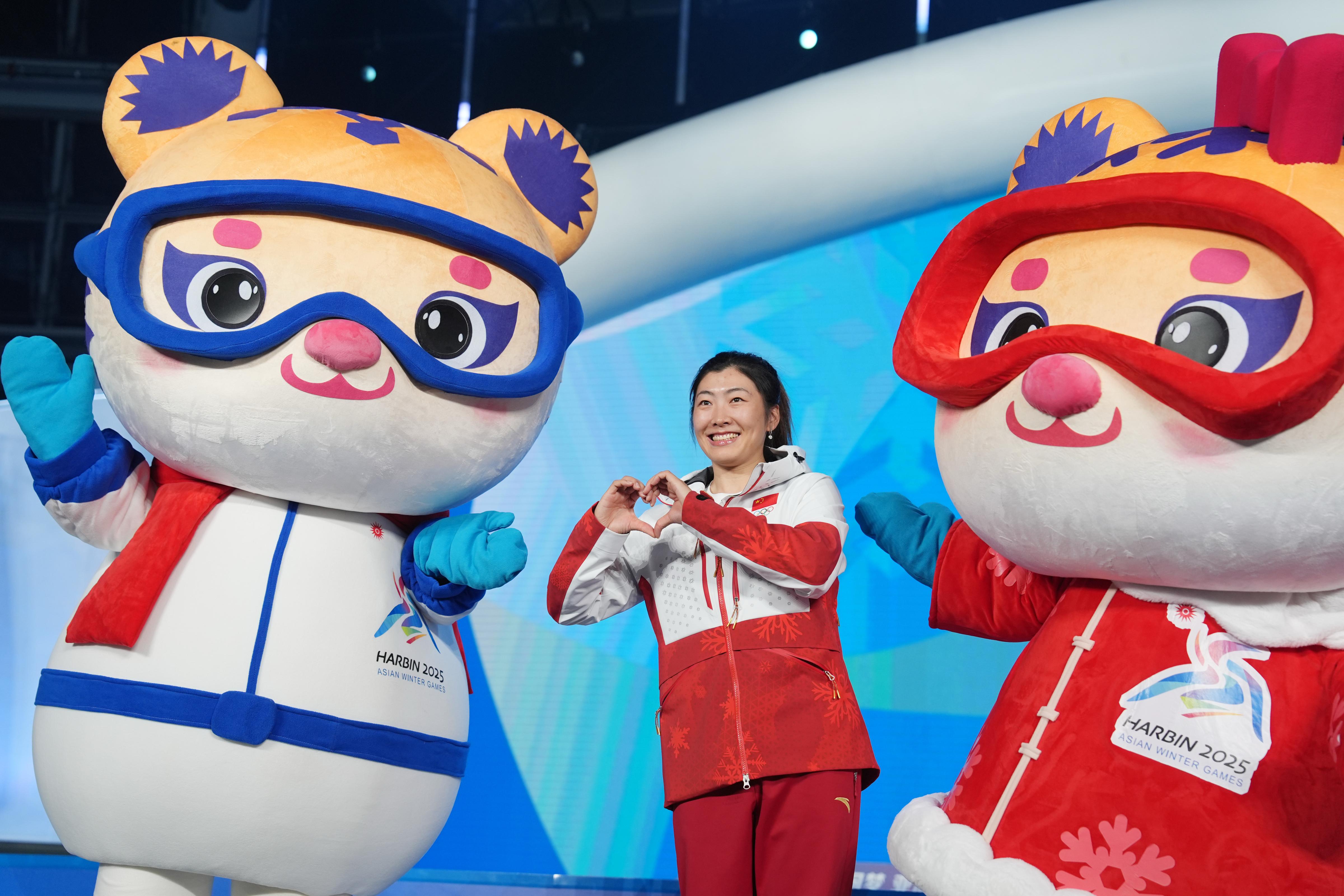 徐梦桃与第九届亚冬会吉祥物“滨滨”和“妮妮”互动。新华社记者 王松 摄