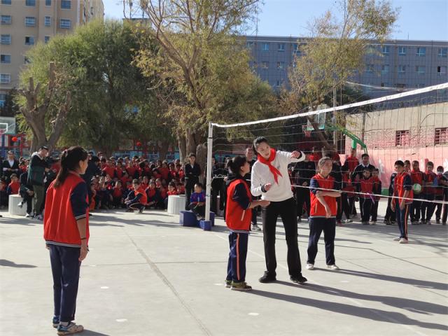 惠若琪在新疆和田市伊里其乡第二中心小学和校排球队交流,并为学校捐赠体育装备。