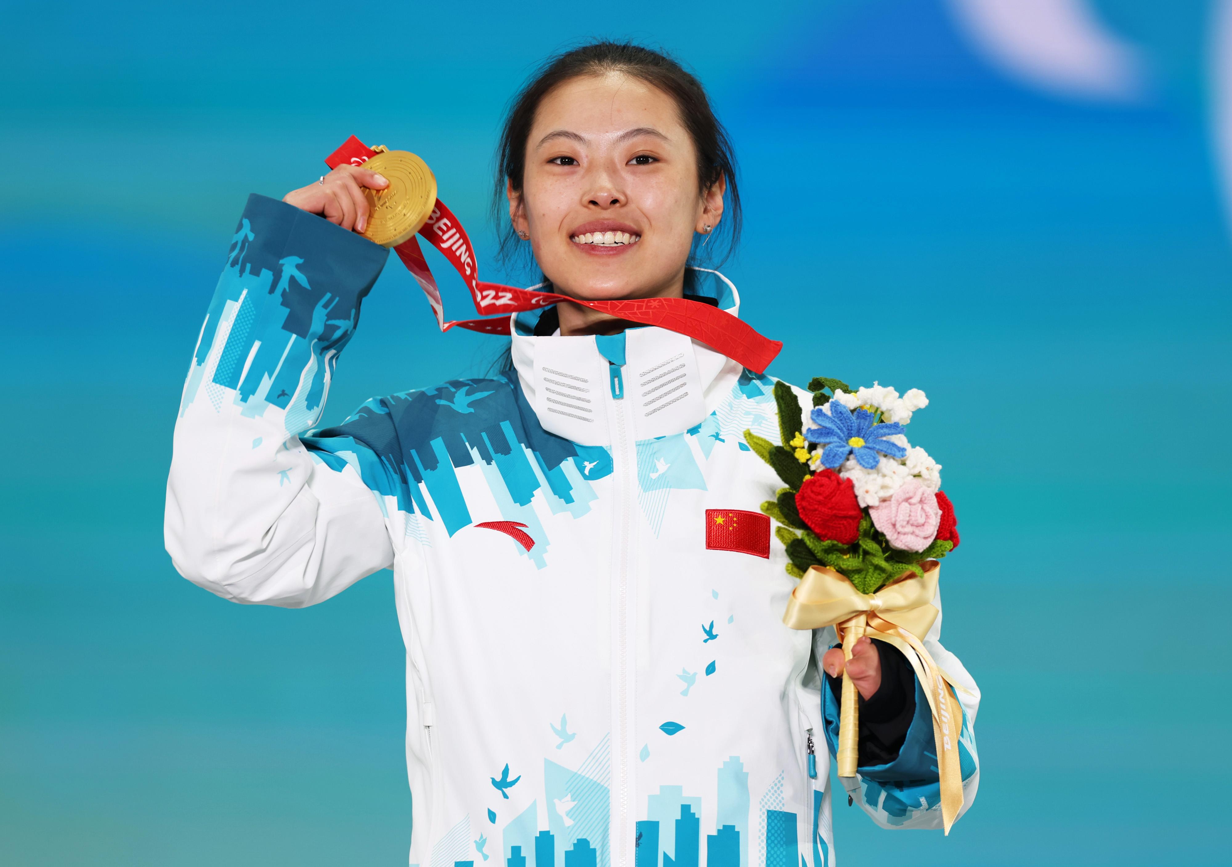 2022年3月6日,中国选手郭雨洁在北京冬残奥会冬季两项——女子短距离(站姿)奖牌颁发仪式上。新华社记者 贾浩成 摄