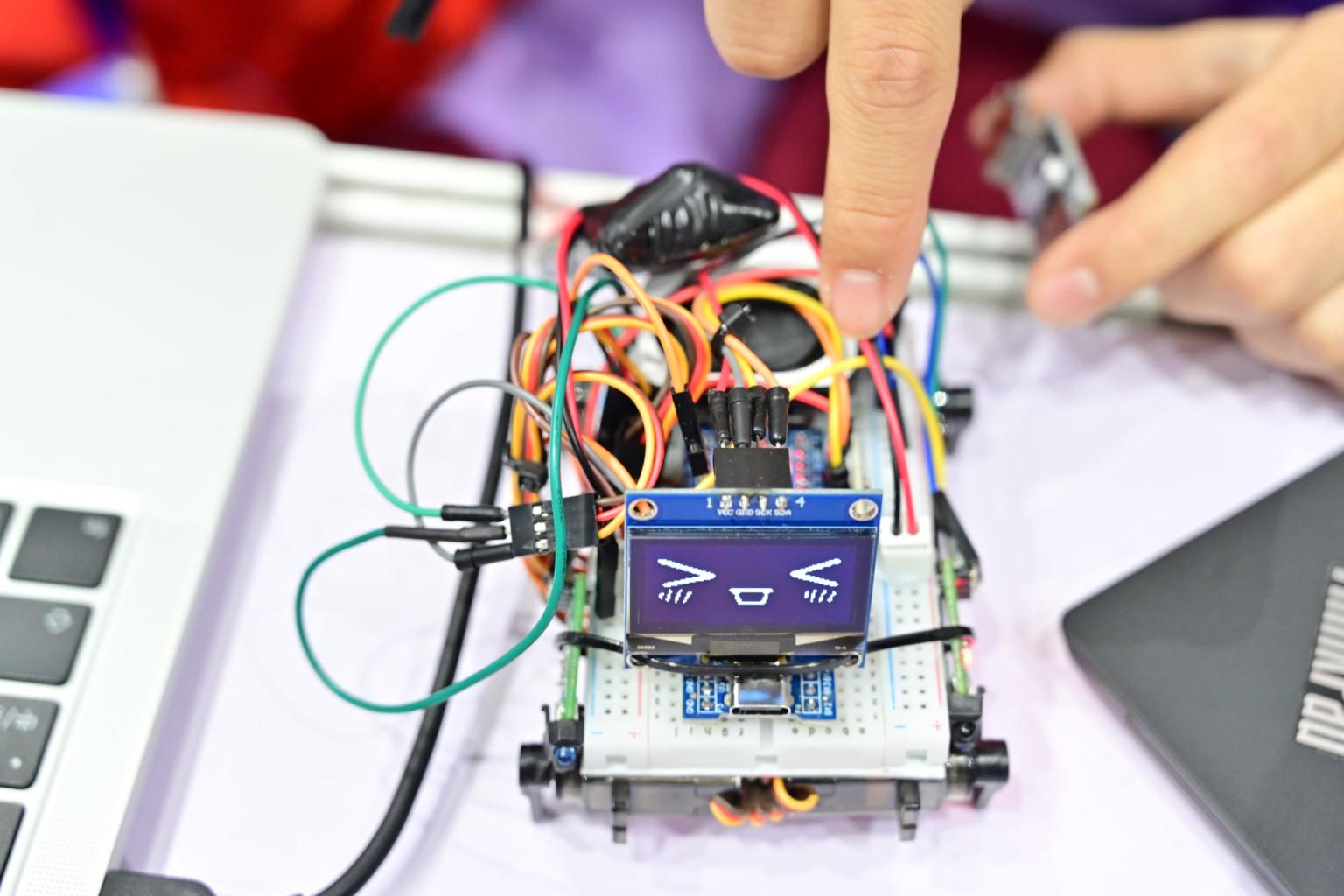 陈子轩一边说一边展示着手里的电子元件,“它是一个软硬件协同运行的共同体,硬件都是我们自己动手焊接的,系统架构和控制程序也由我们自主设计和编写。”他介绍,“硬件上,我们选择了功能强大且性价比高的芯片,搭载双红外避障等功能模块。软件上,将语音交互、环境感知、运动执行、AI语音模块等分别编程,使得它们能够互相联系,互相通信。并且创新嵌入了DeepSeek(深度求索)云端对话集成模块,实现自由对话。”