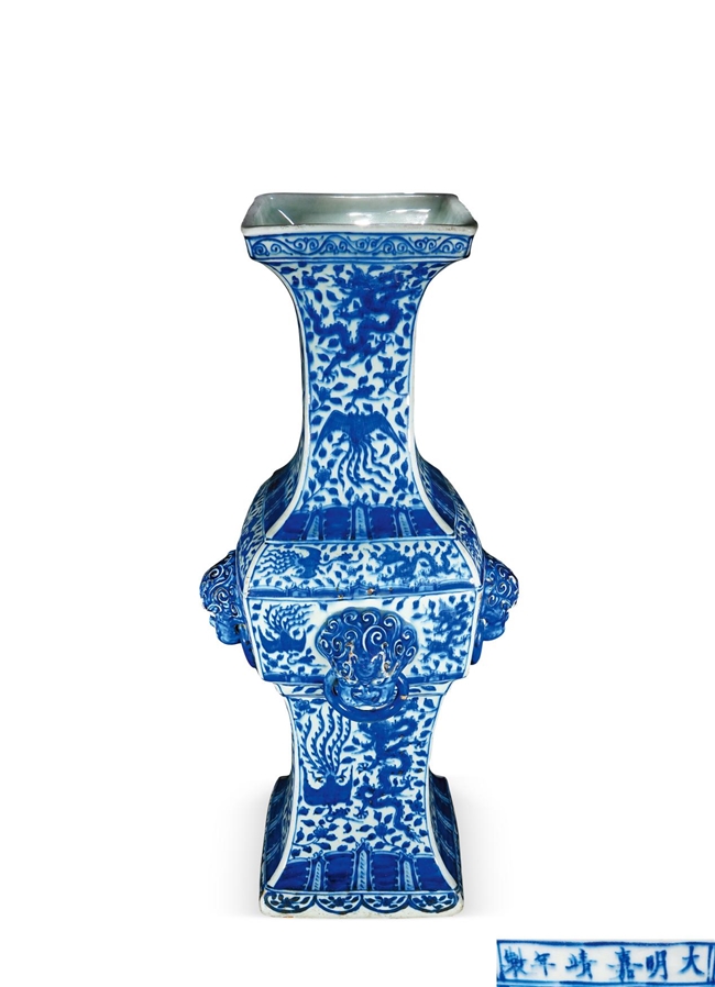 中国古董珍玩专场同样精彩纷呈,明清瓷器、玉器、杂项等品类应有尽有。明清瓷器中,明代正德娇黄釉绿彩花卉纹碗与台北故宫博物院藏,从胎体到釉料,刻花与形态如出一辙;明嘉靖青花龙凤纹铺首四方花觚成造技术、难度为同类之最,体现了嘉靖时期瓷质花觚的恢宏磅礴。玉器部分明代玉熊等珍品演绎了“石之美者”的千年传奇。杂项部分则集纳了文房清供、金属器、漆器等多元品类,清乾隆紫檀雕西番莲嵌玉博古挂屏为故宫残件,兼具实用与观赏价值。另有田黄雕牧牛图摆件等当代田黄玉雕精品和各类珍稀珠宝。