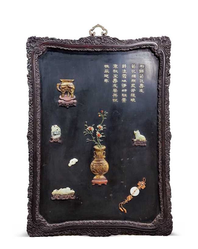 清乾隆 紫檀雕西番莲嵌玉博古挂屏