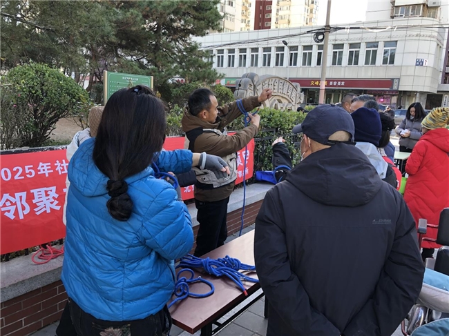 活动特邀国际救援志愿服务队队员开展了消防培训,内容包括烟雾逃生、各种灭火器材的使用、学打逃生结等,通过“讲解+实操”闭环模式,有效提升居民应急能力,携手筑牢社区安全防线。