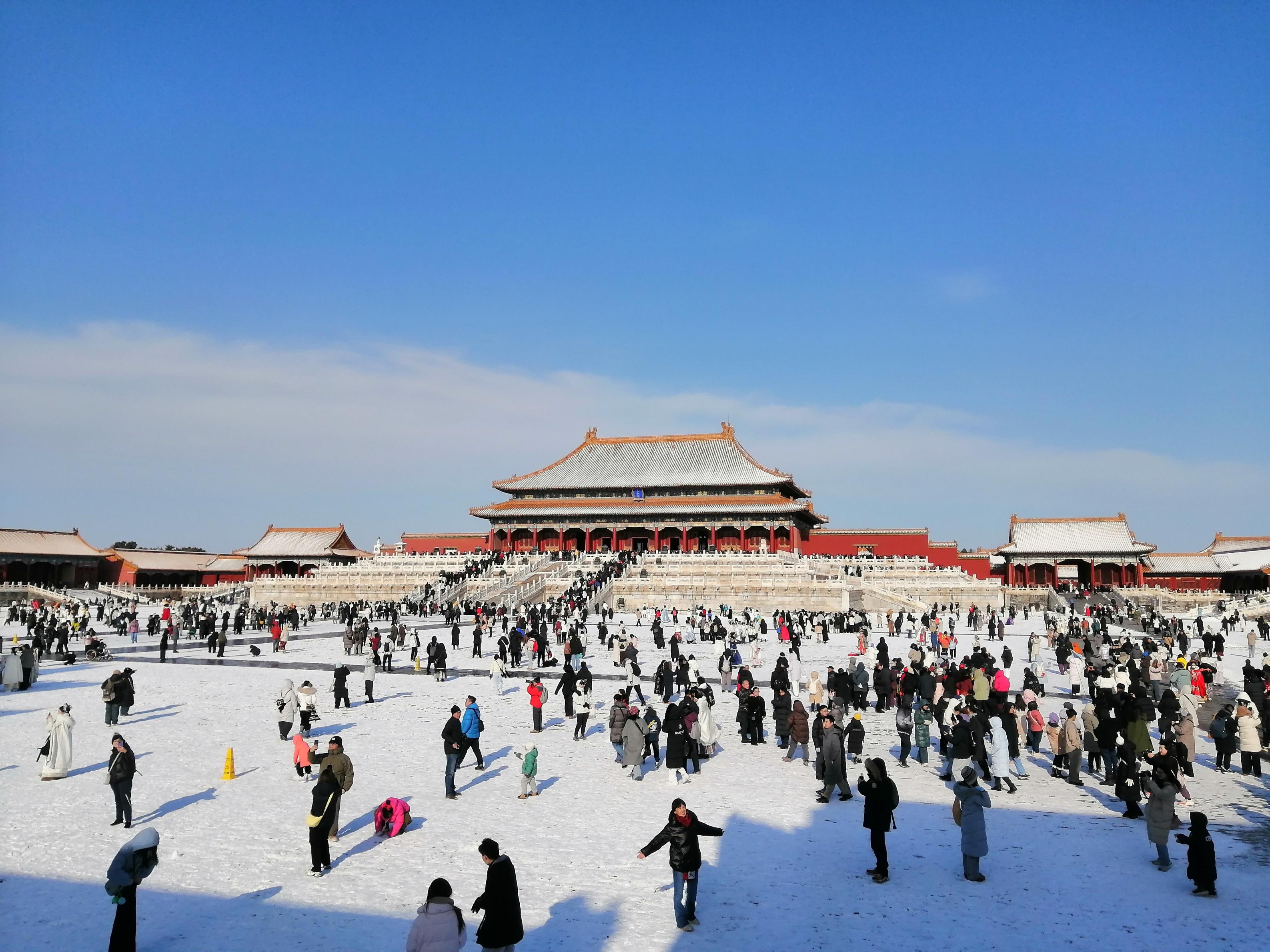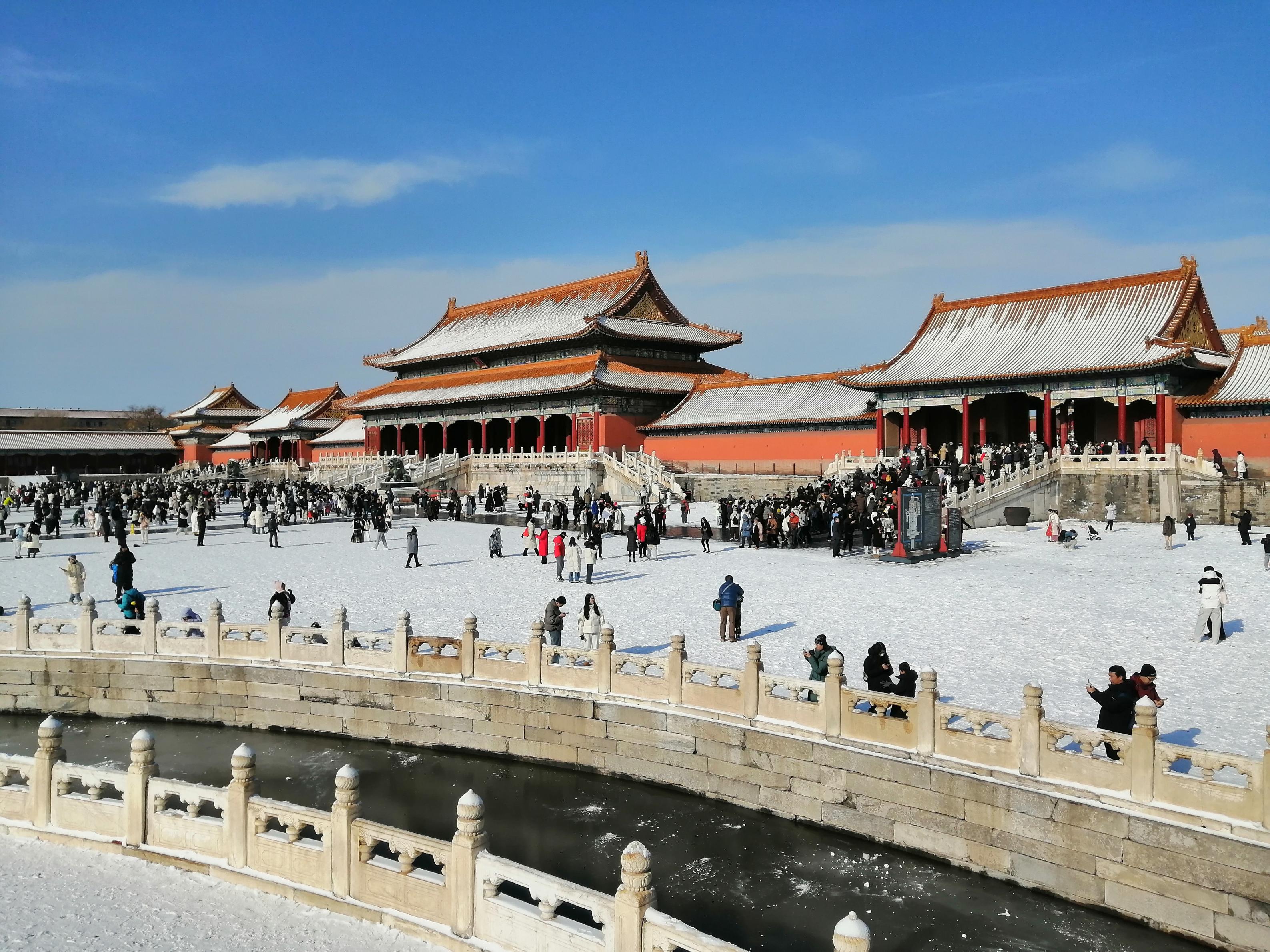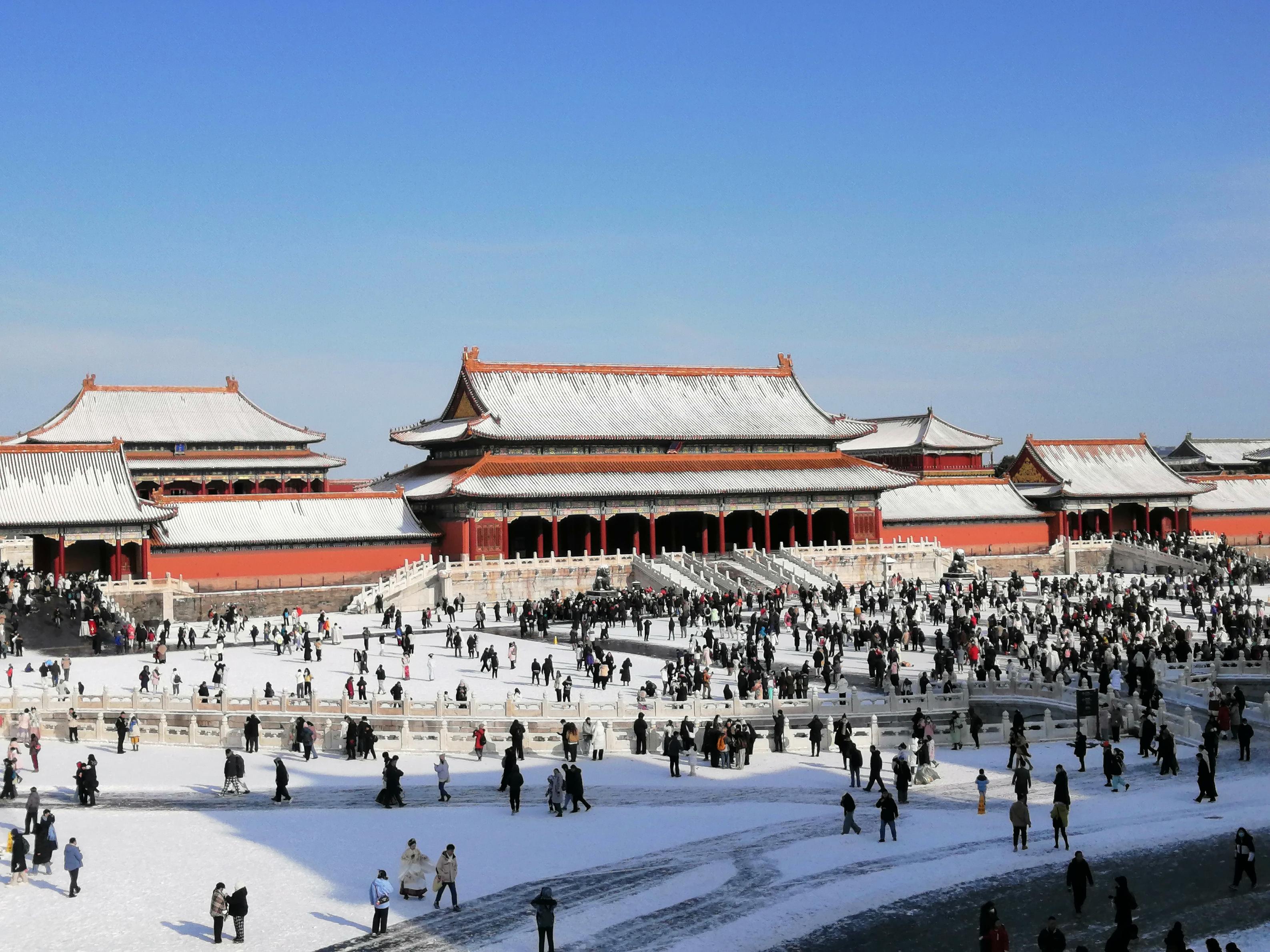 12月13日,北京大雪过后,天气晴好。故宫解锁限定雪景,大批游人纷纷前来参观,打卡拍照,定格美好瞬间。
