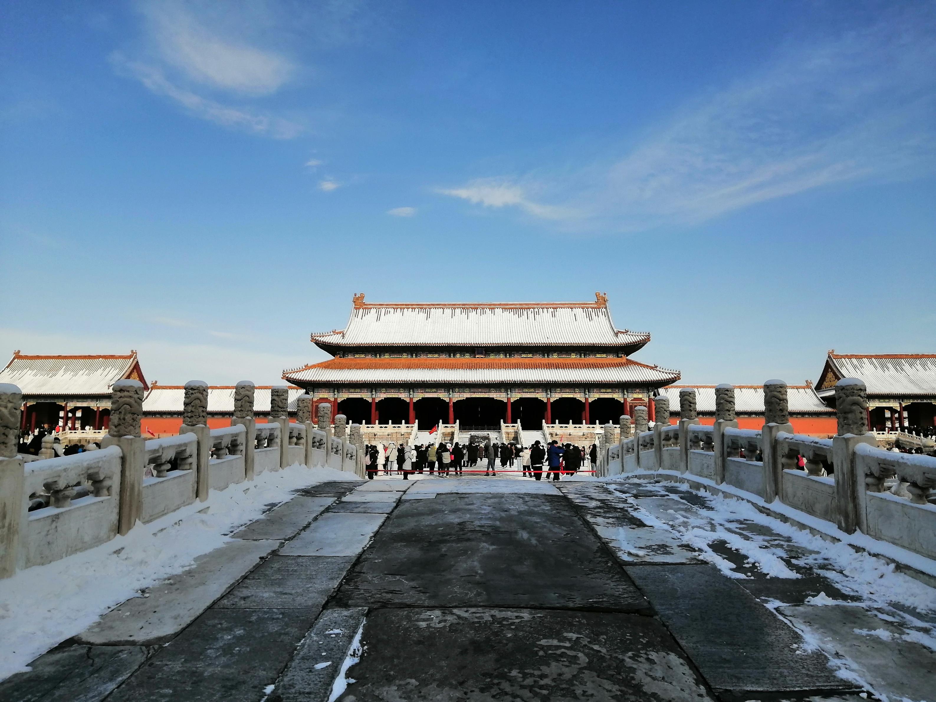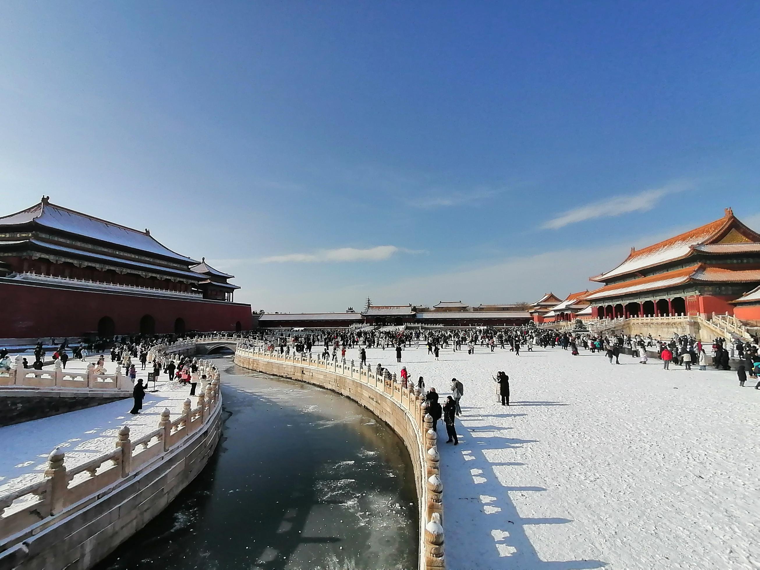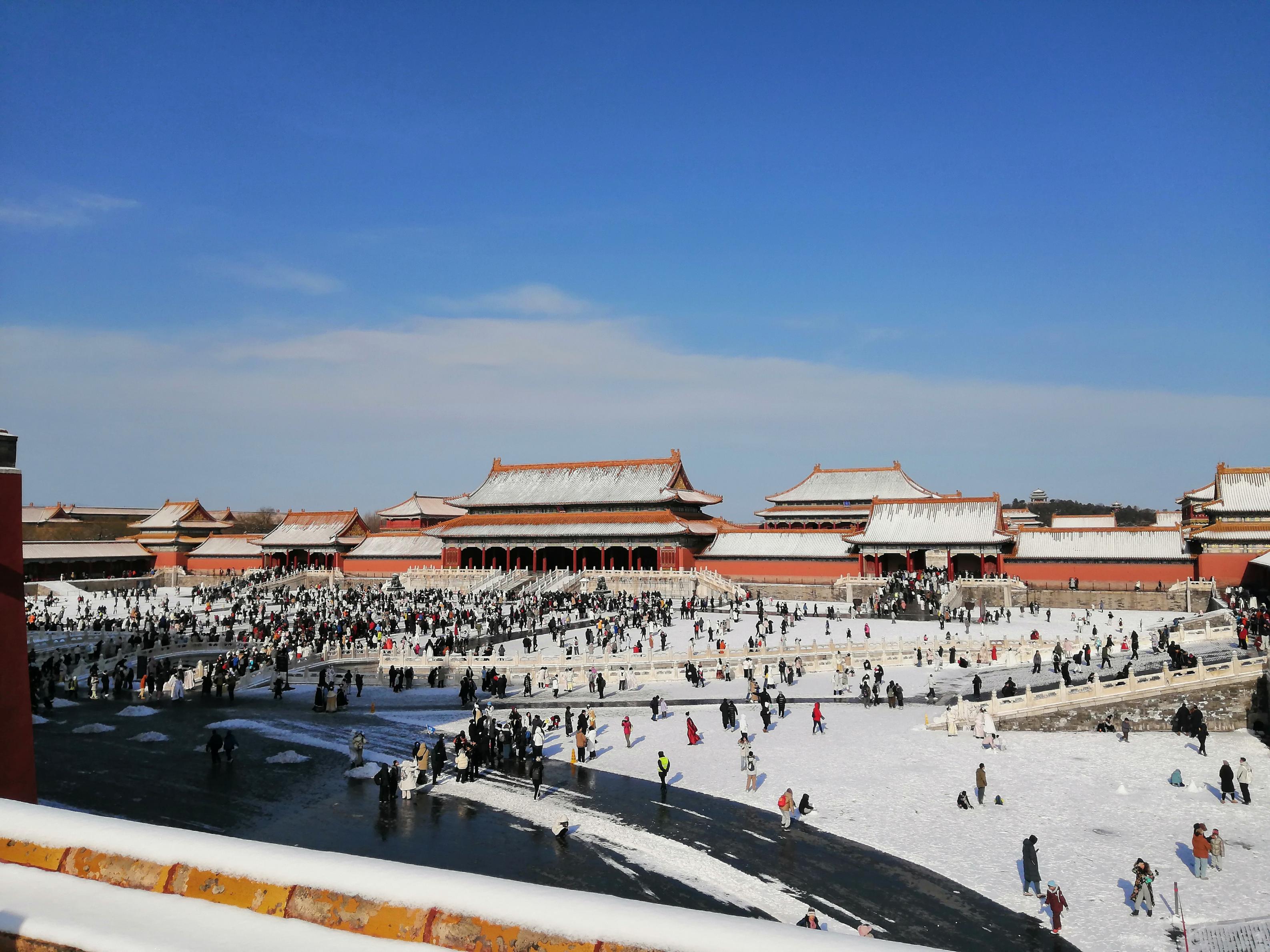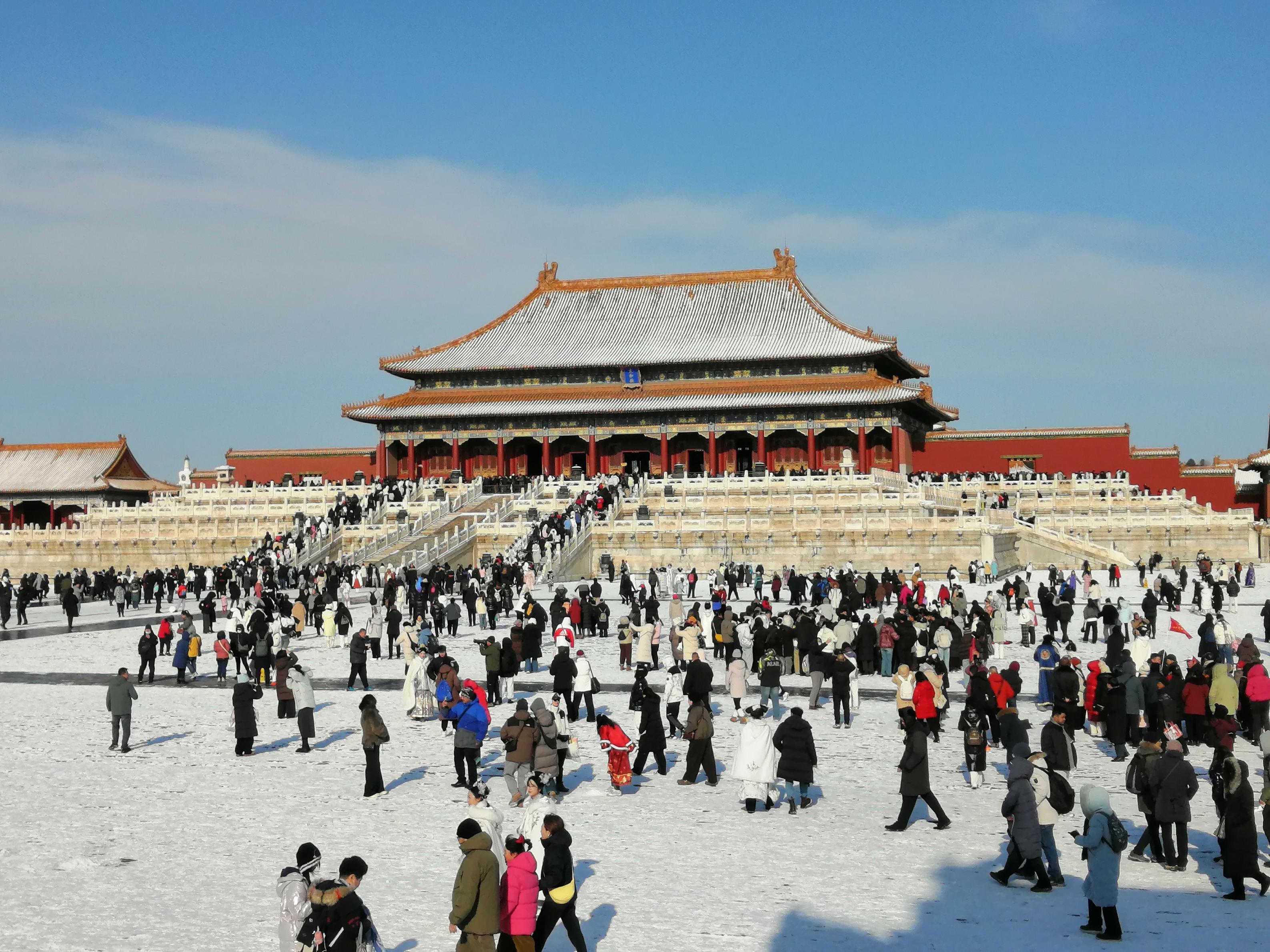 12月13日,北京大雪过后,天气晴好。故宫解锁限定雪景,大批游人纷纷前来参观,打卡拍照,定格美好瞬间。