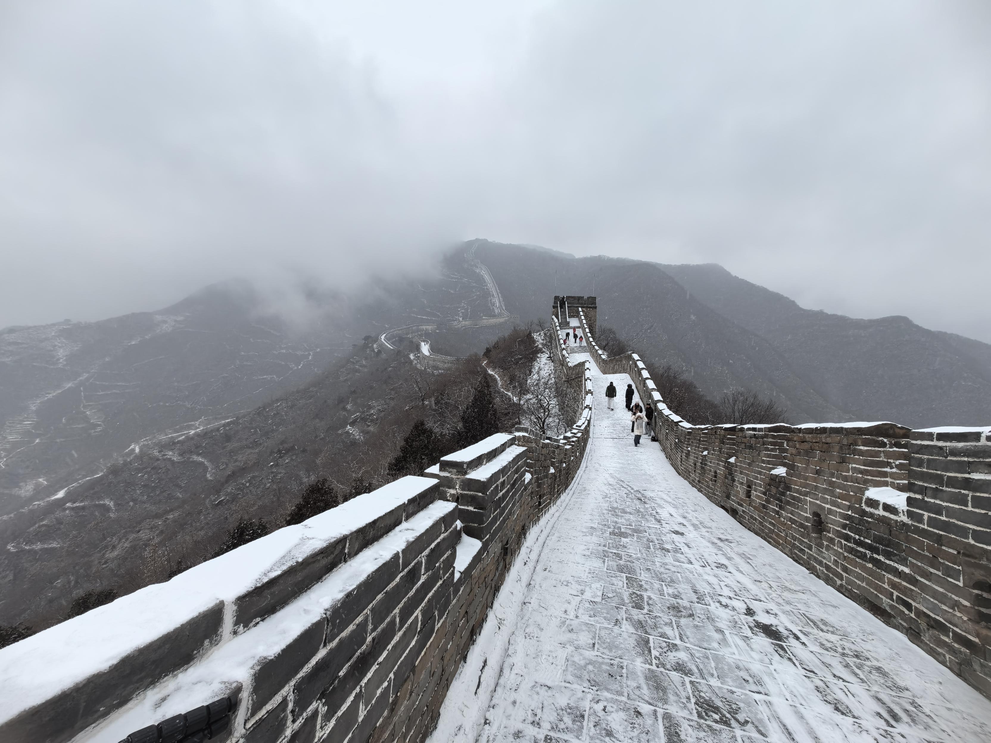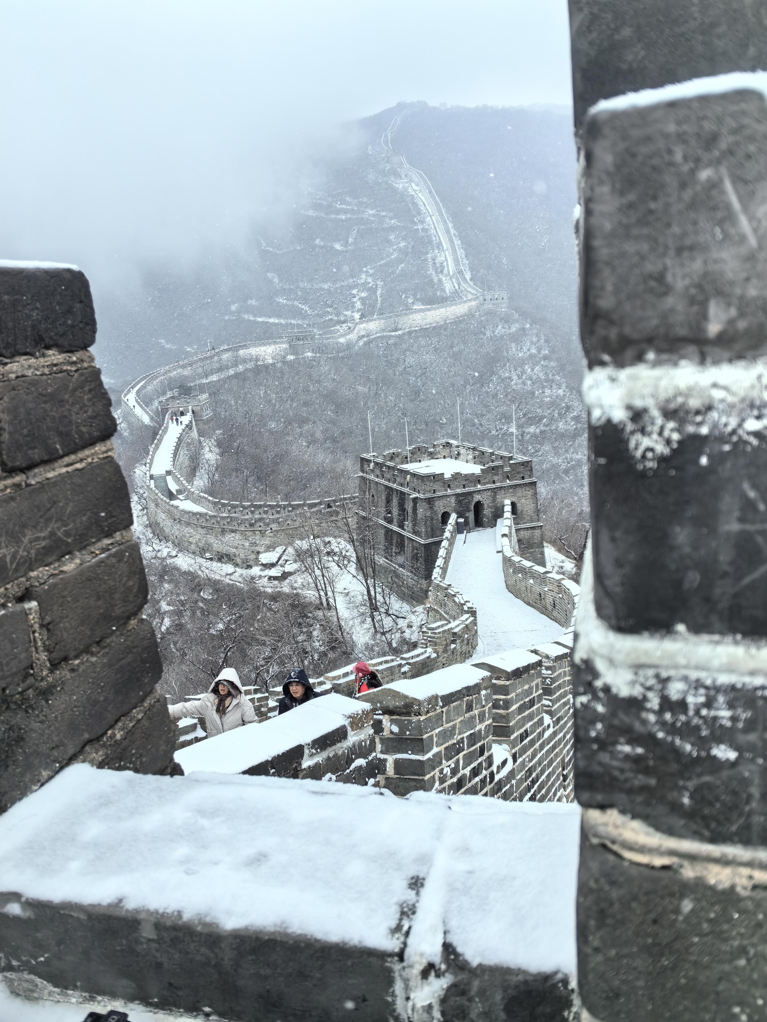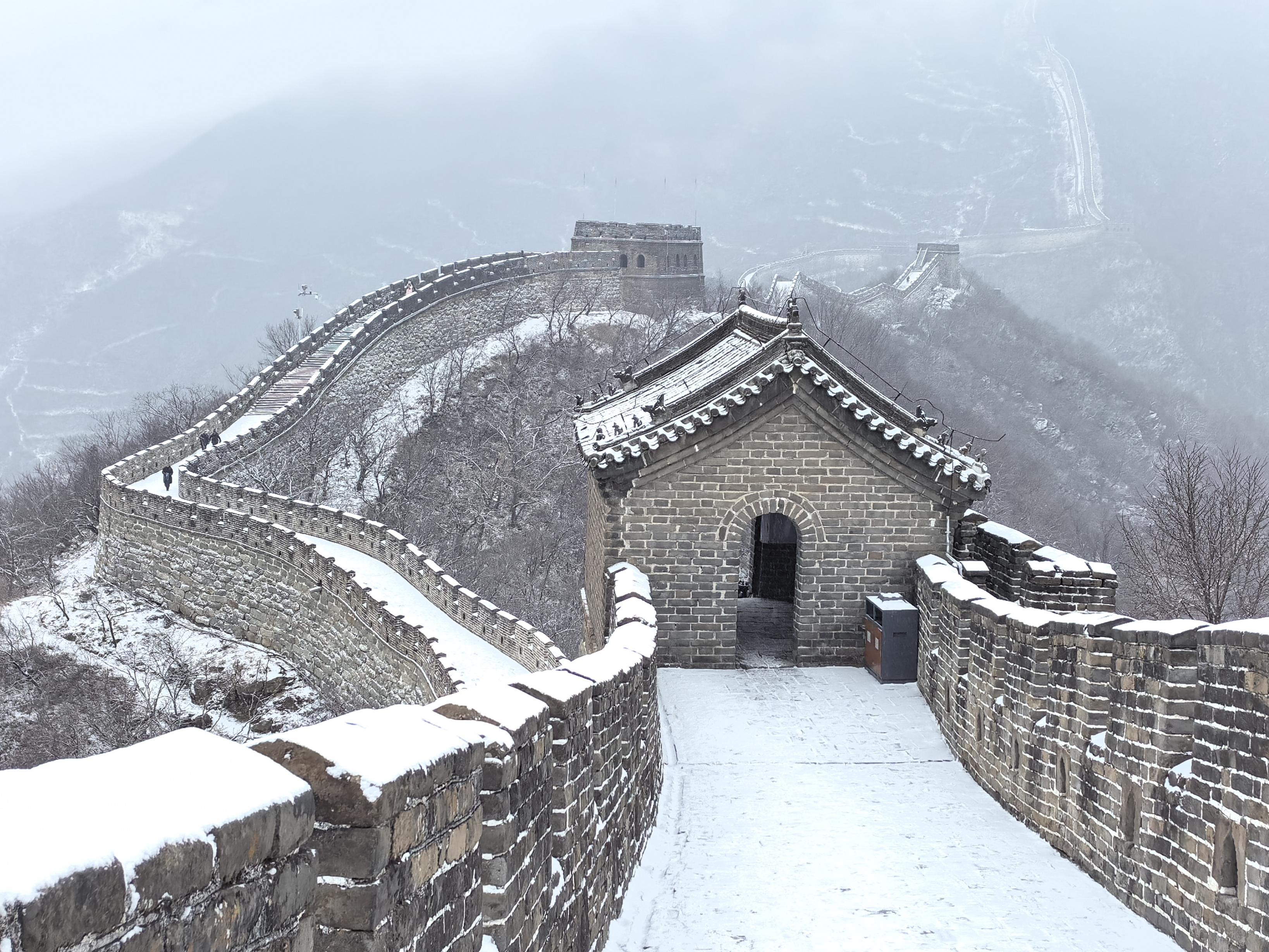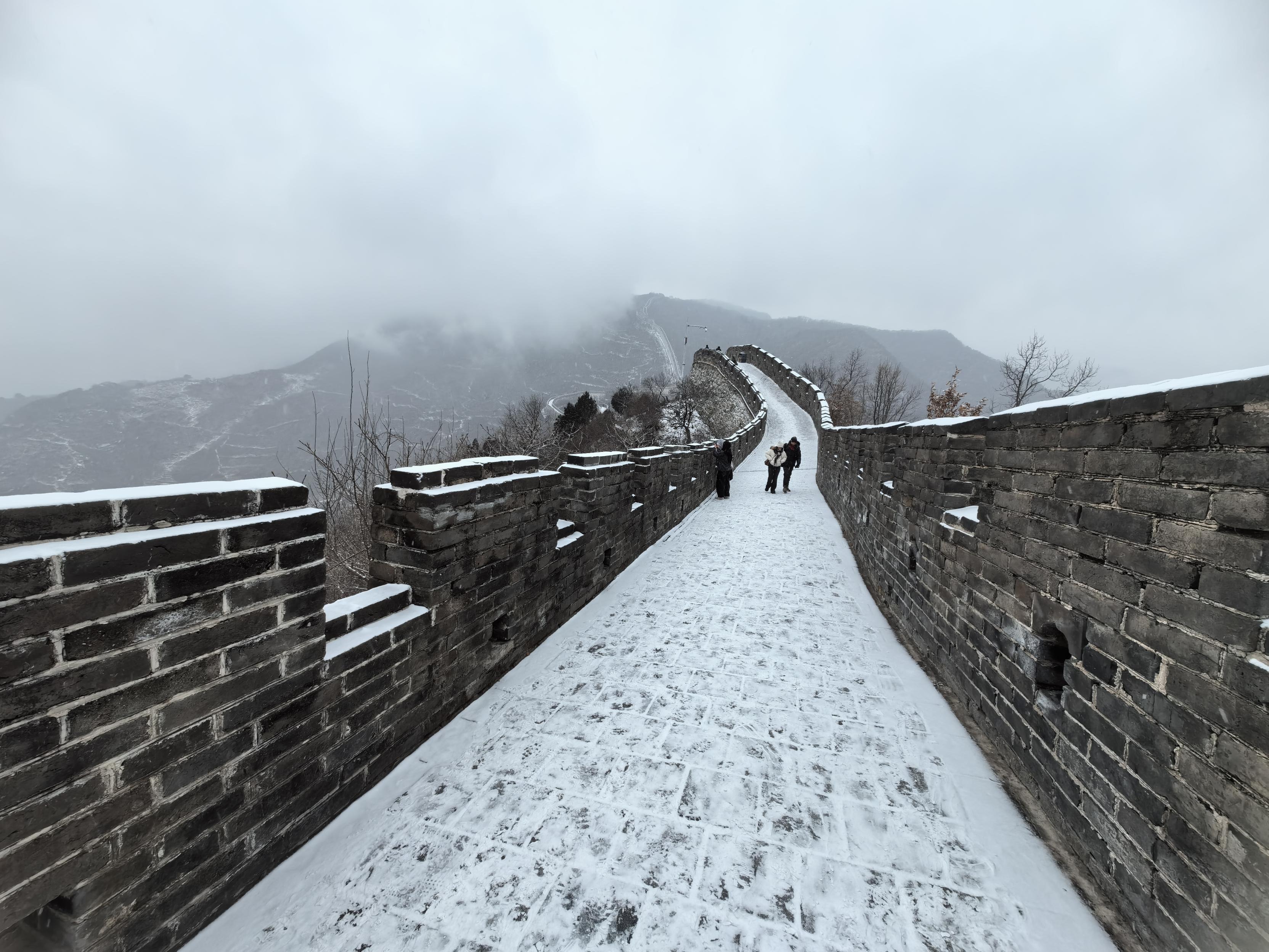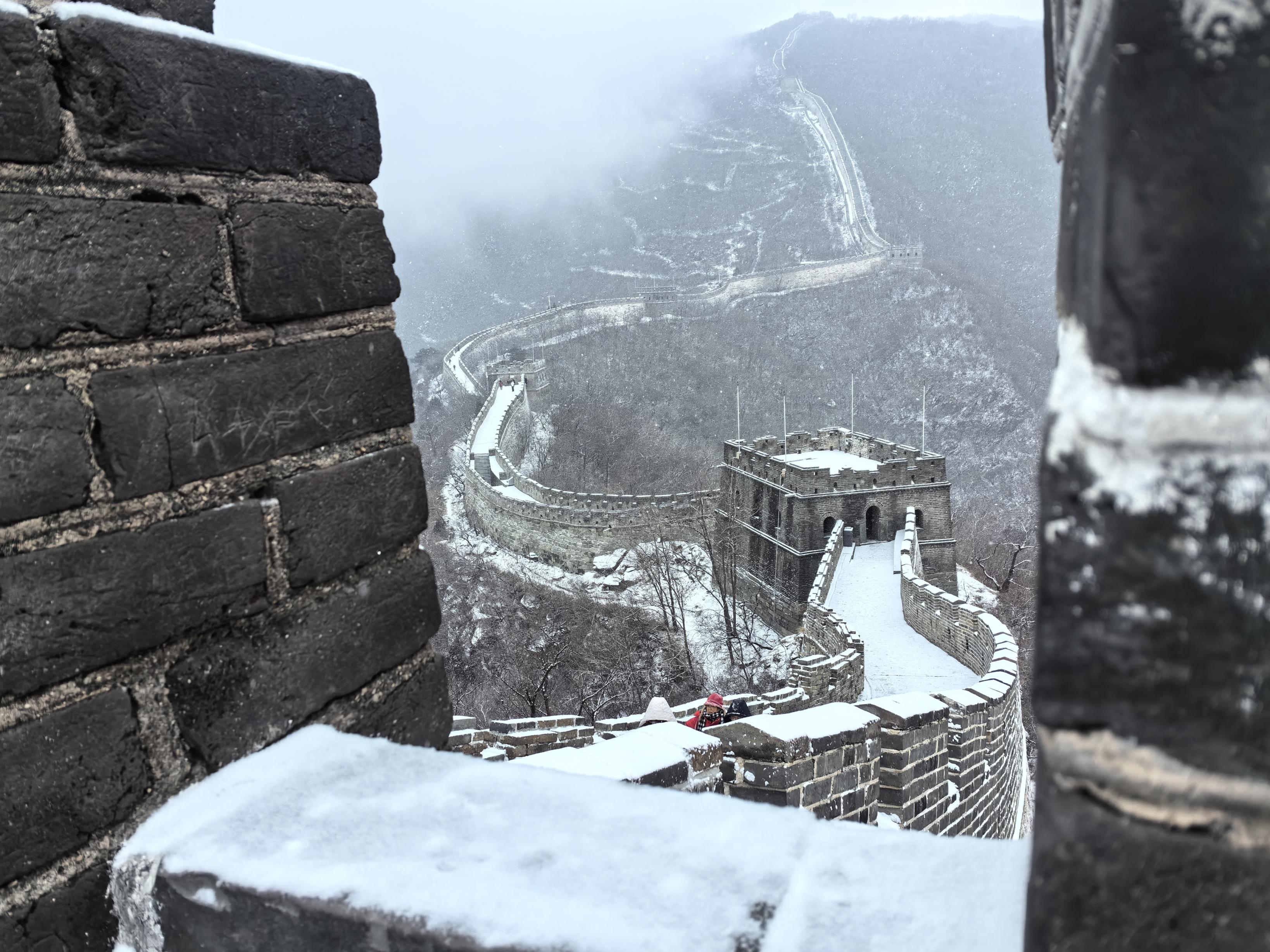 12月13日,北京迎来今年入冬后的首场降雪。位于怀柔区的慕田峪长城在纷飞的雪花中披上银装,呈现出壮丽景象。白雪覆盖的长城蜿蜒于山脊之上,气势磅礴。昔日雄关的敌台、烽火台在积雪映衬下更显静谧庄严,别具冬日韵味,吸引了众多游客和摄影爱好者前来观赏。