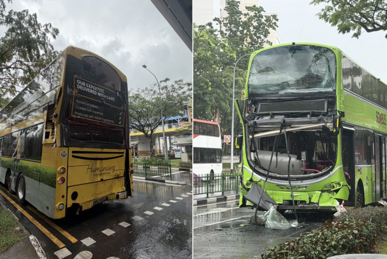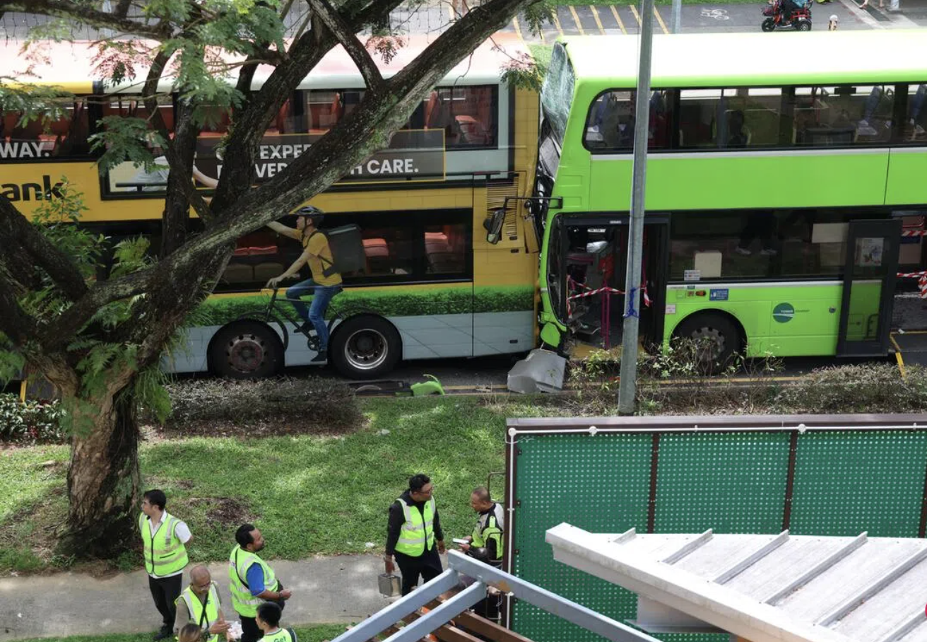 当地时间14日上午,新加坡裕廊西地区发生两辆双层巴士相撞事故。图自外媒