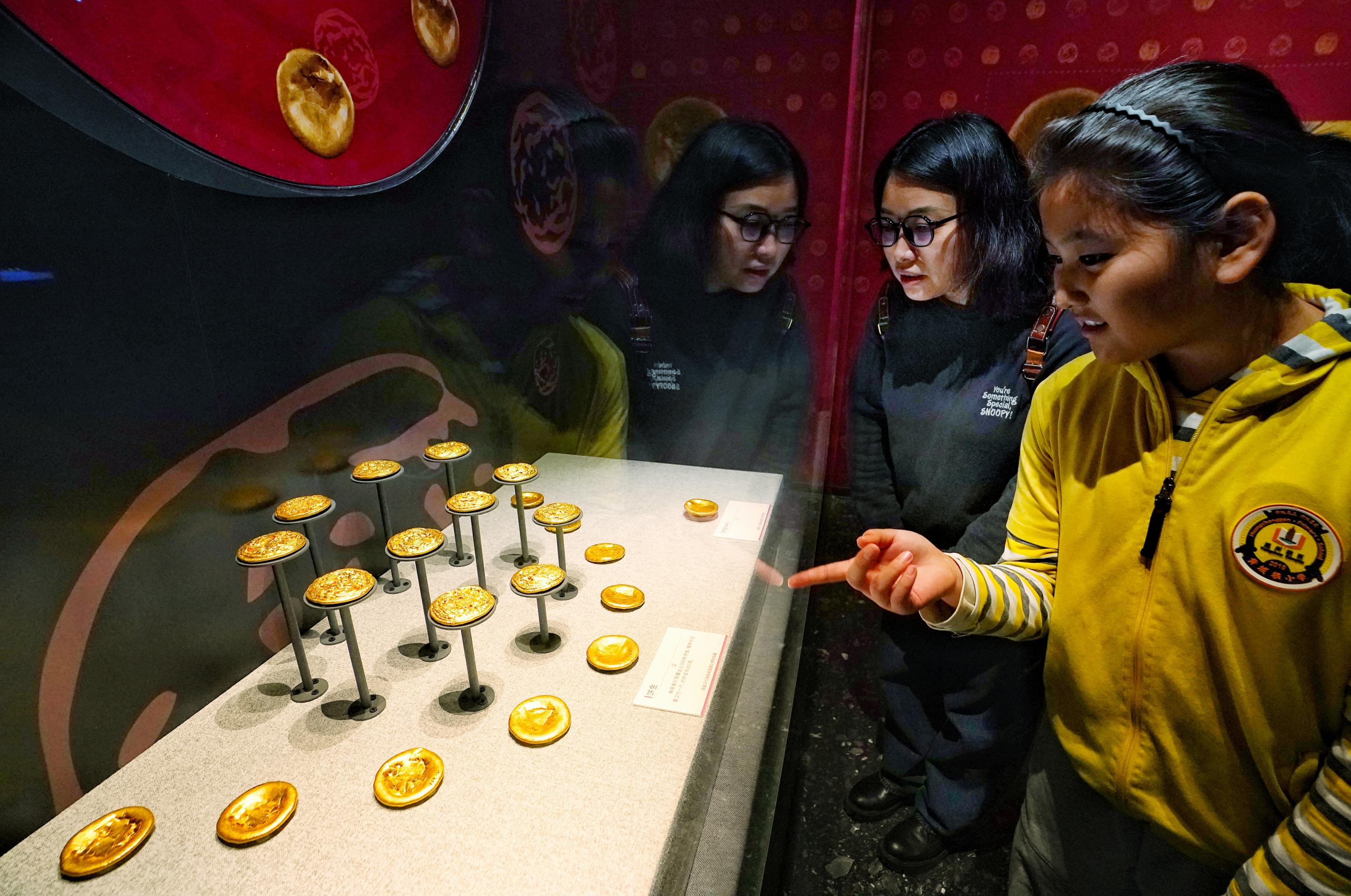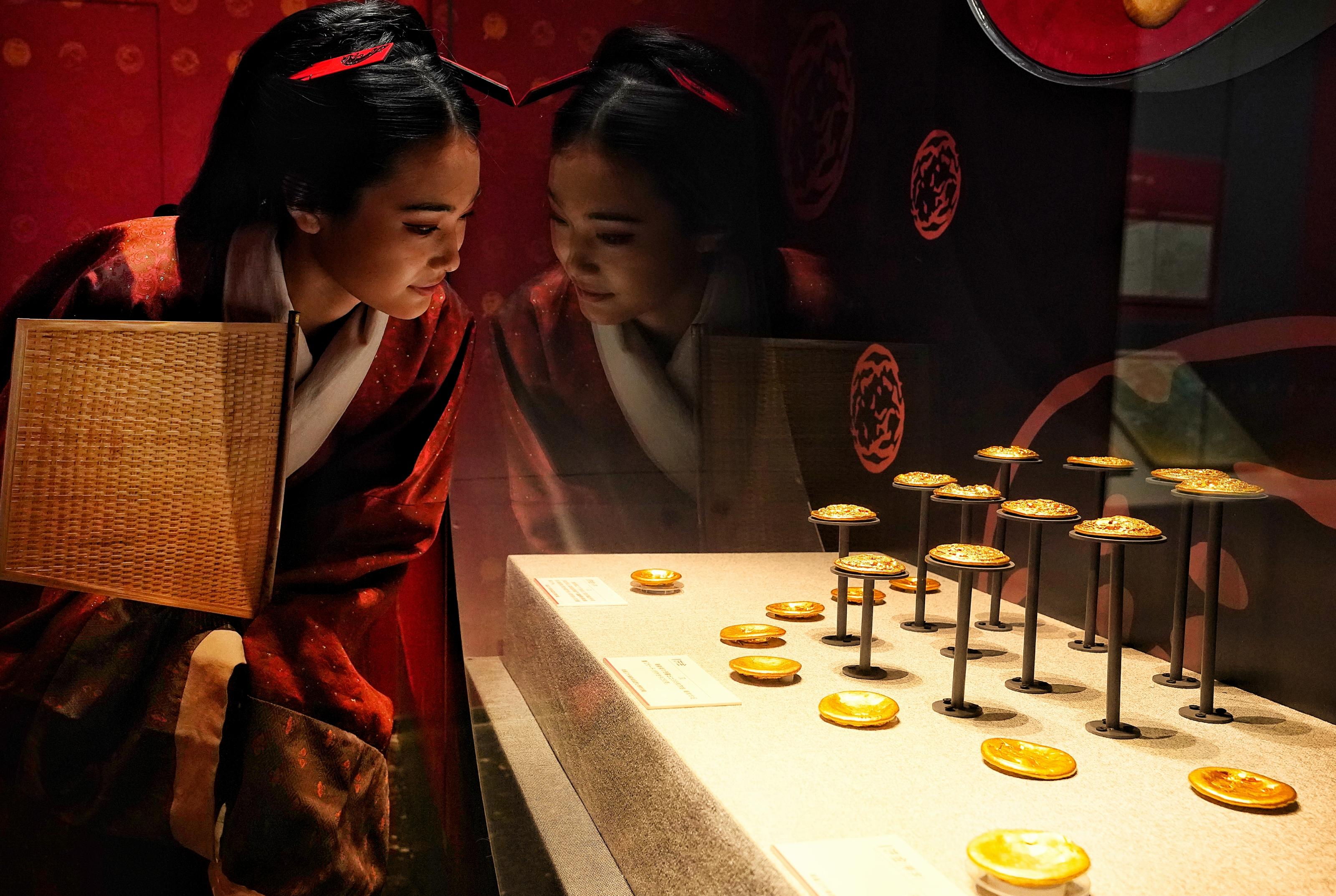 “褭蹏金形状像马蹄,也被大家称作马蹄金,它和麟趾金底部均刻有‘上’‘中’‘下’铭文,以精湛花丝镶嵌工艺铸就,既是汉武帝时期的祥瑞纪念币,更暗藏着森严的等级秩序,它们专用于赏赐服从中央的诸侯王。”邢宇告诉记者。