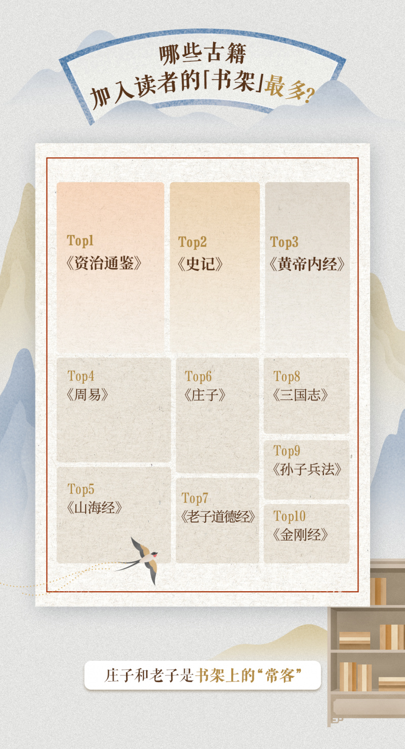 2025年4月,识典古籍App正式上线,用户可通过手机便捷查看古籍并使用各项功能,进一步降低了古籍阅读门槛。报告数据显示,App内《资治通鉴》《山海经》《黄帝内经》成为最受读者喜爱的古籍Top3,其中《资治通鉴》每日吸引近千名读者阅览,同时也是每日被加入“书架”最多的古籍;《庄子》《道德经》等经典著作也常年占据读者“书架”热门位置。