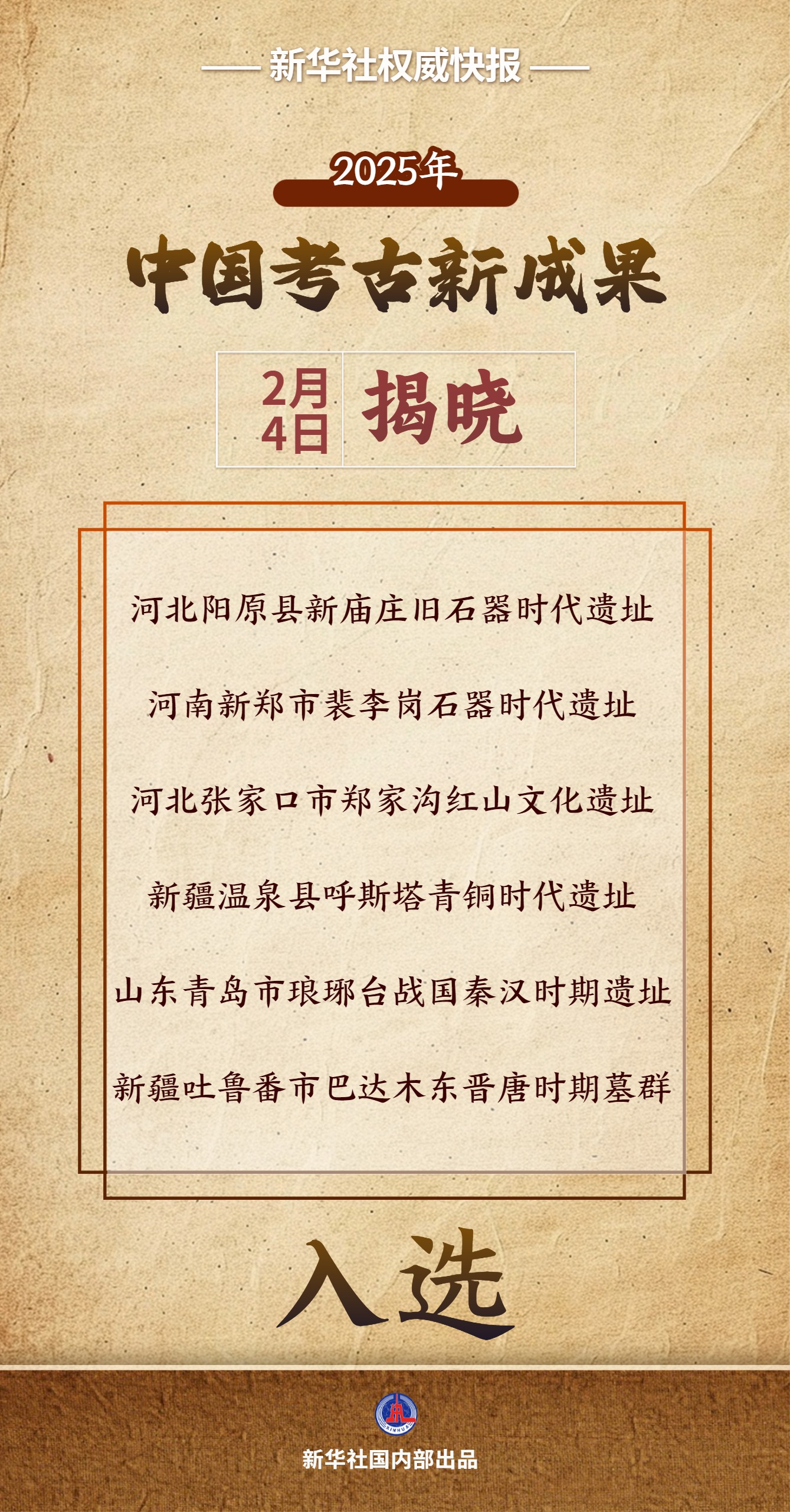2月4日,中国社会科学院发布“2025年中国考古新成果”。河北阳原县新庙庄旧石器时代遗址、河南新郑市裴李岗石器时代遗址、河北张家口市郑家沟红山文化遗址、新疆温泉县呼斯塔青铜时代遗址、山东青岛市琅琊台战国秦汉时期遗址、新疆吐鲁番市巴达木东晋唐时期墓群6个项目入选。