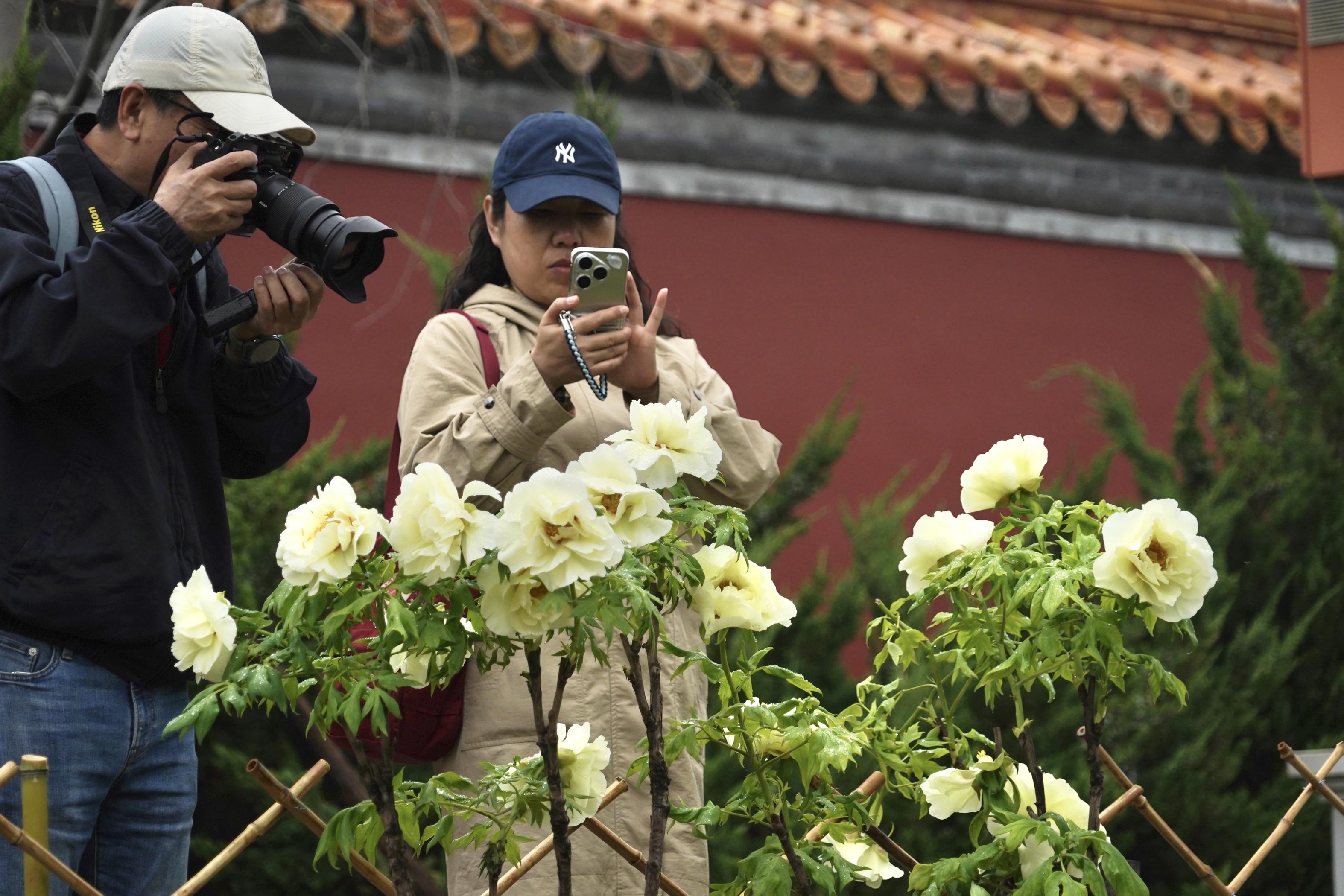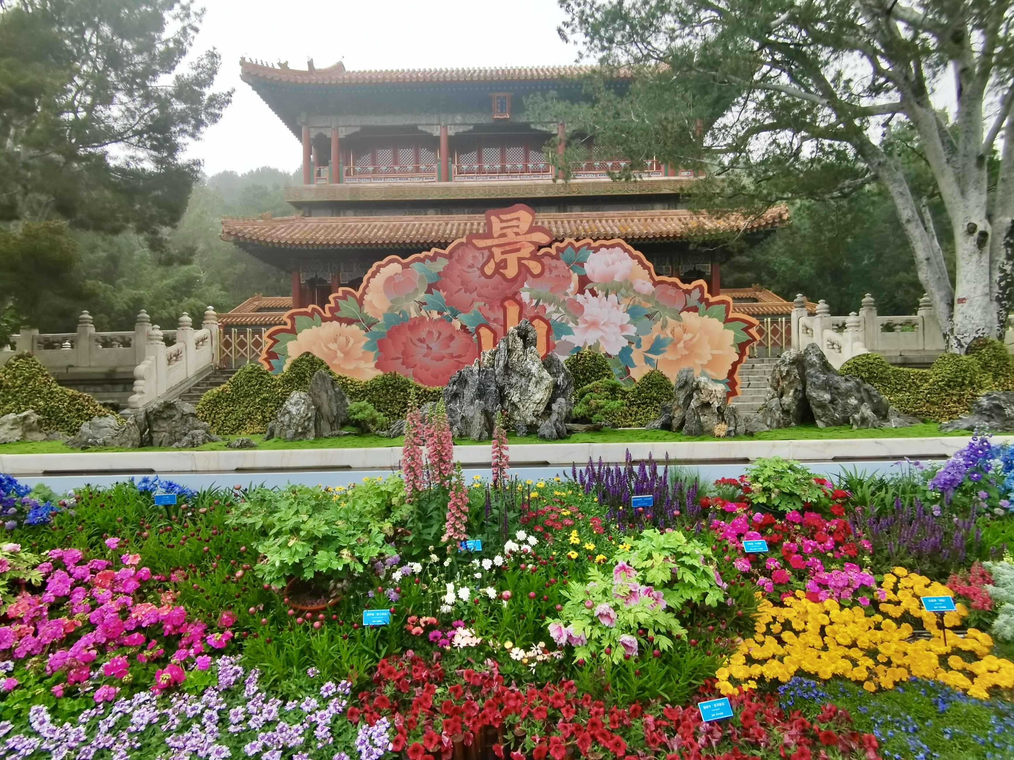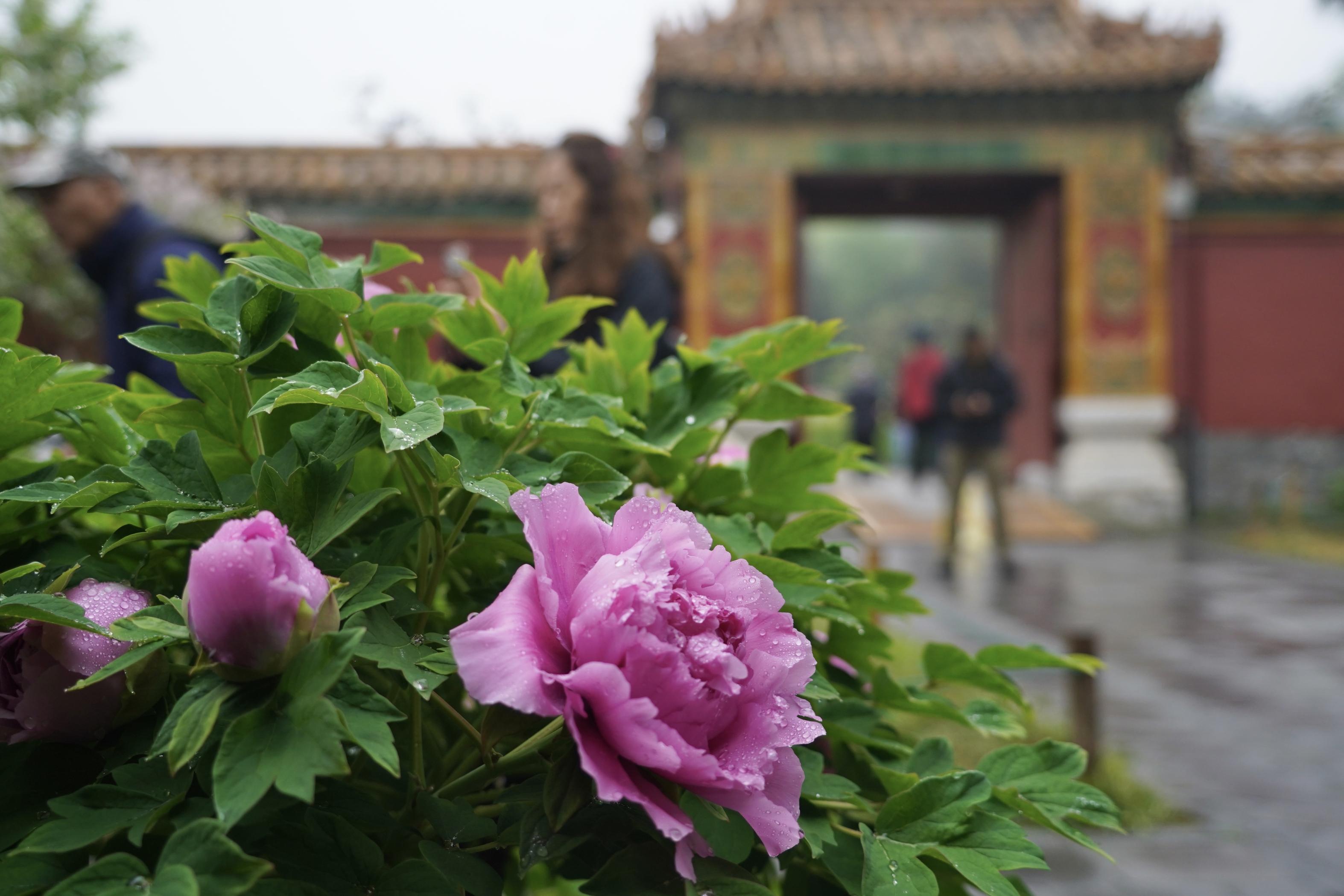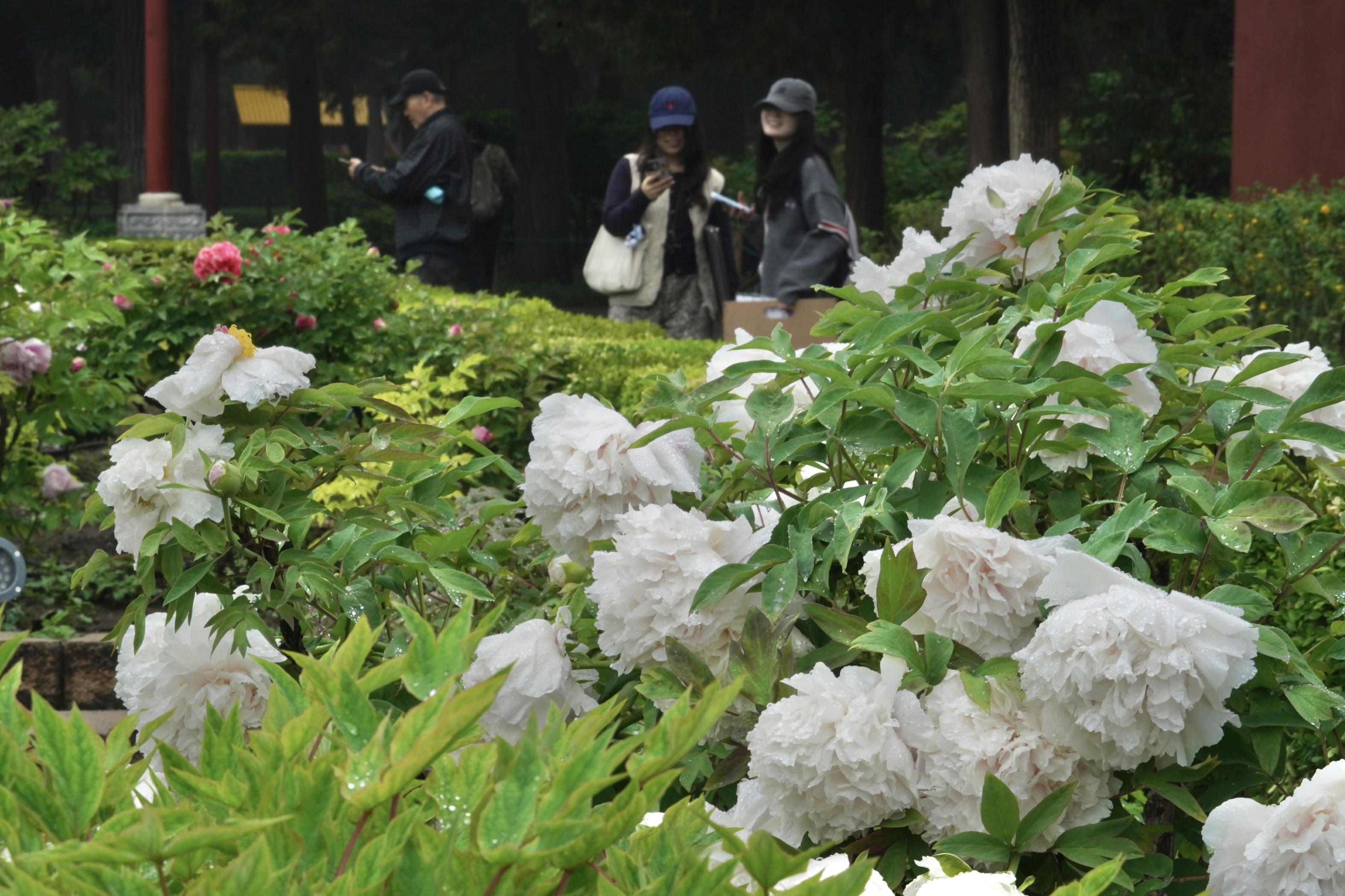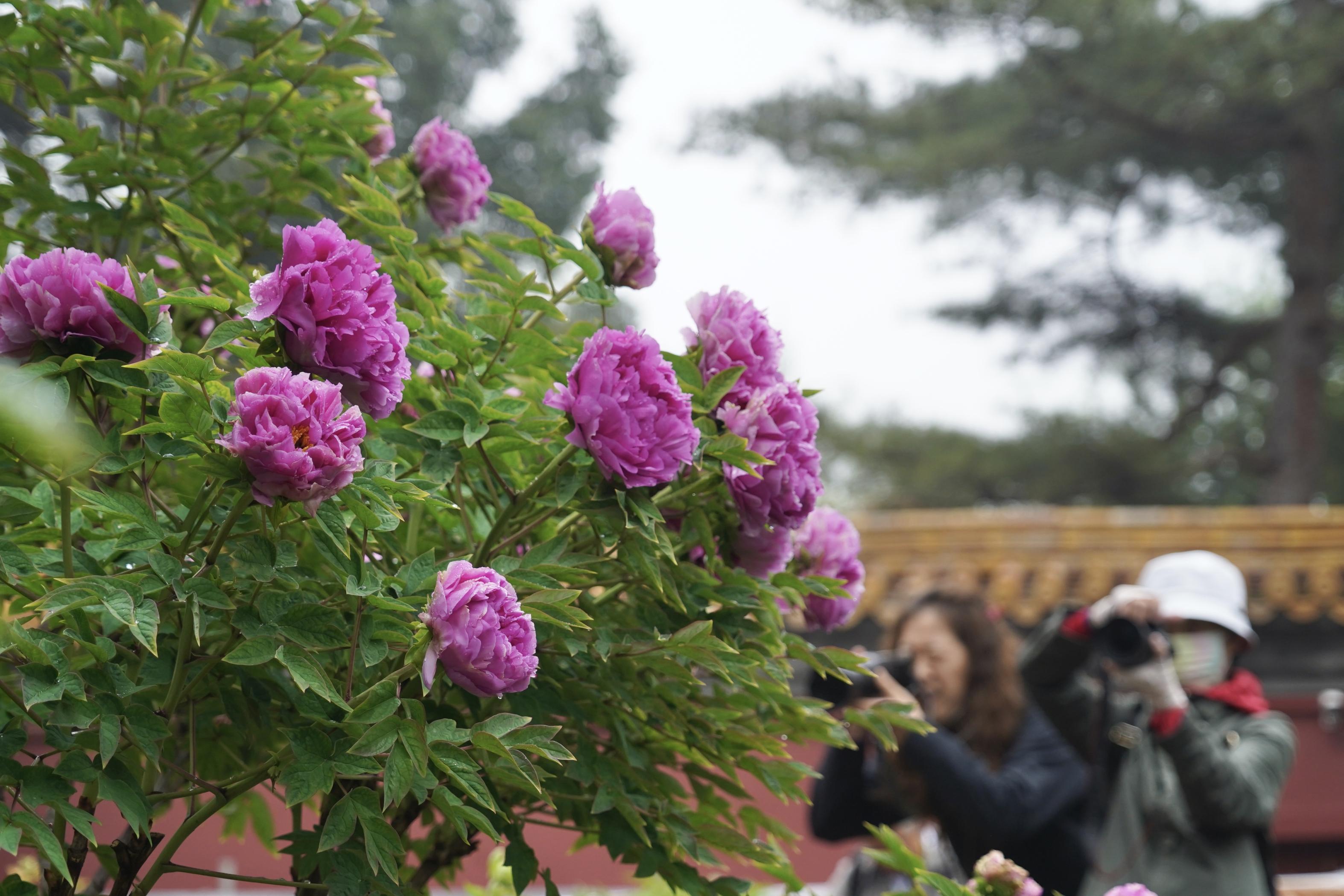 作为景山春日观景的经典路线,“牡丹路”位于公园前山,沿北京中轴线两侧对称延展,视野开阔、步移景异。当前,各色牡丹已次第绽放,连绵花海与近处的绮望楼、高处的万春亭等标志性古建同框,红墙为纸、花影为墨,勾勒出极具视觉冲击力的春日胜景。游客行至此处,随手一拍便能定格“古风大片”,捕捉牡丹花瓣上的光影,定格古建飞檐下一抹雍容的国色。